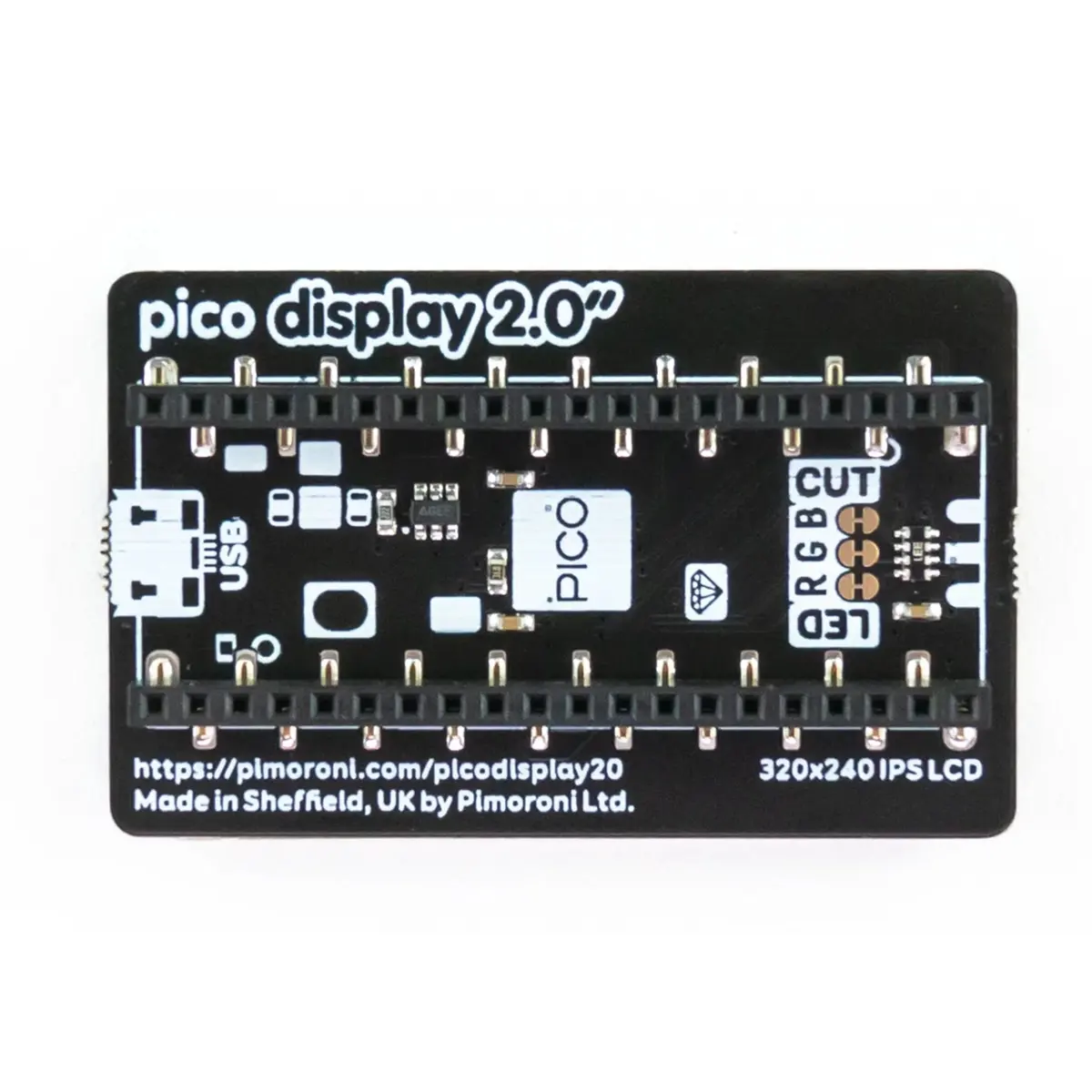 Este ecrã IPS de 320x240 pixéis encaixa majestosamente à parte de trás do seu Pico, tem cores exuberantes, grandes ângulos de visão e permite-lhe transformar um Pico num dispositivo de interface de utilizador para um projeto maior, capaz de dar instruções, exibir leituras e até incorporar elaborados menus.
