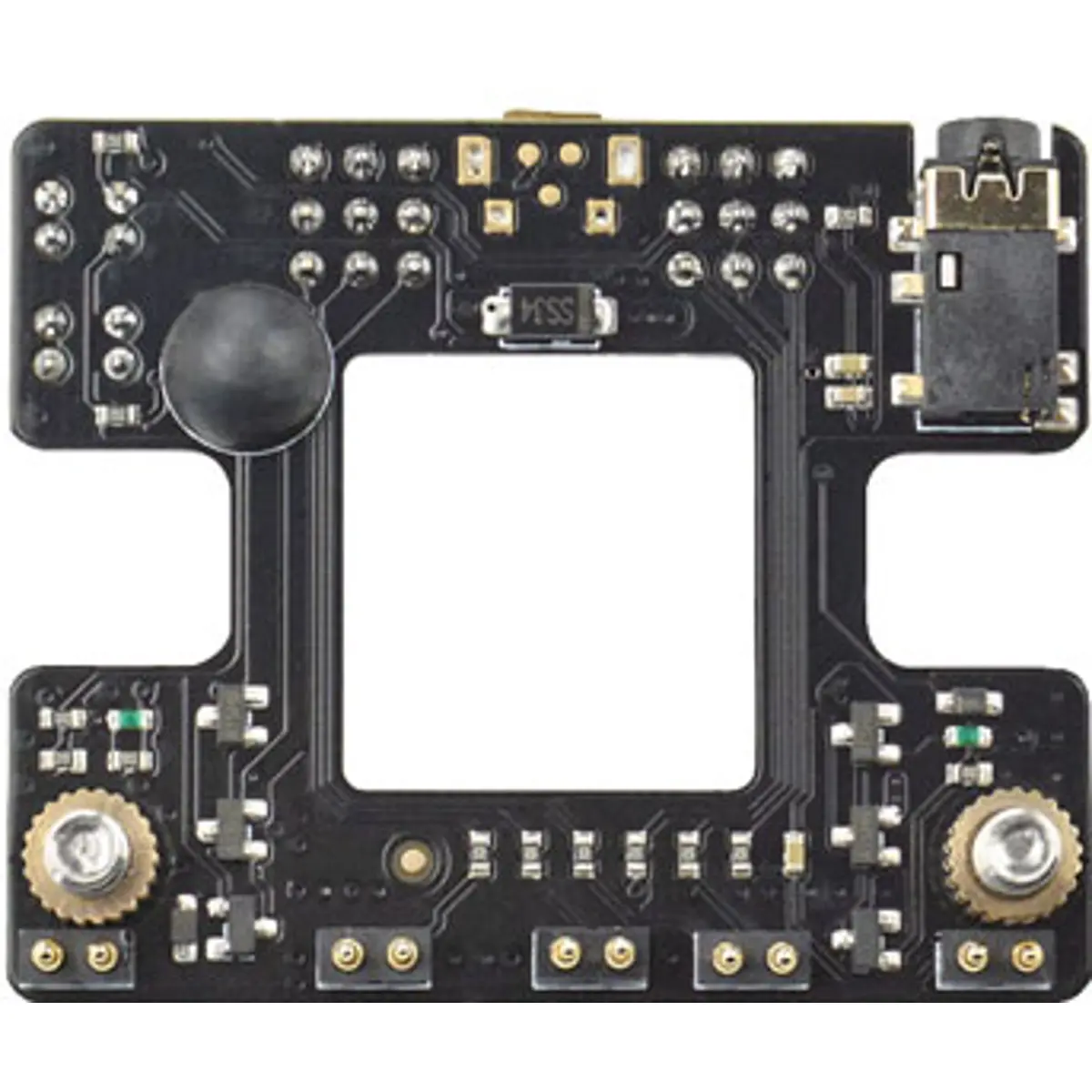 micro:Mate está na mesma dimensão de micro:bit e liga-se ao micro:bit através de pinos de contato (com mola), garantindo uma conexão fácil, compacta e segura. O batente de borracha e o conector de áudio de 3.5 mm na parte traseira mantêm a expansão instalada de forma estável na placa.