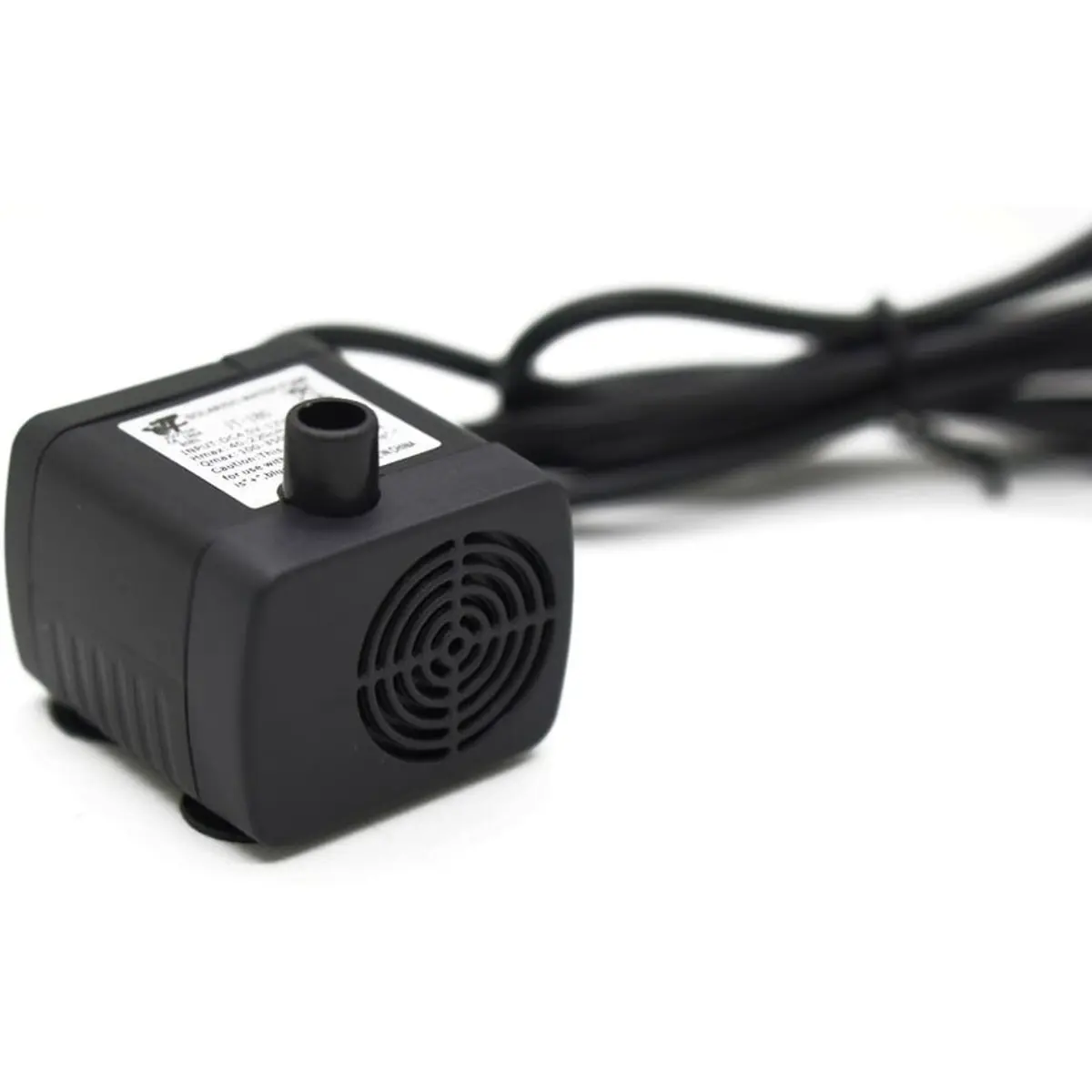 Esta bomba de água submersível é ideal para regar plantas, criar fontes ou quedas de água, ou para trocar a água de aquários. Funciona de forma silenciosa, com ruído inferior a 30 dB; é alimentada entre 3,5 e 12 V DC e consome 0,5 a 5 W. Possui filtro interno e ventosa para fixação em superfícies lisas, cabo de 1 m, dimensões compactas (38 x 38 x 29 mm) e peso de 125 g. Altura de bombeamento de 40 a 220 cm e caudal de 100-350 L/h. Uso apenas submerso.