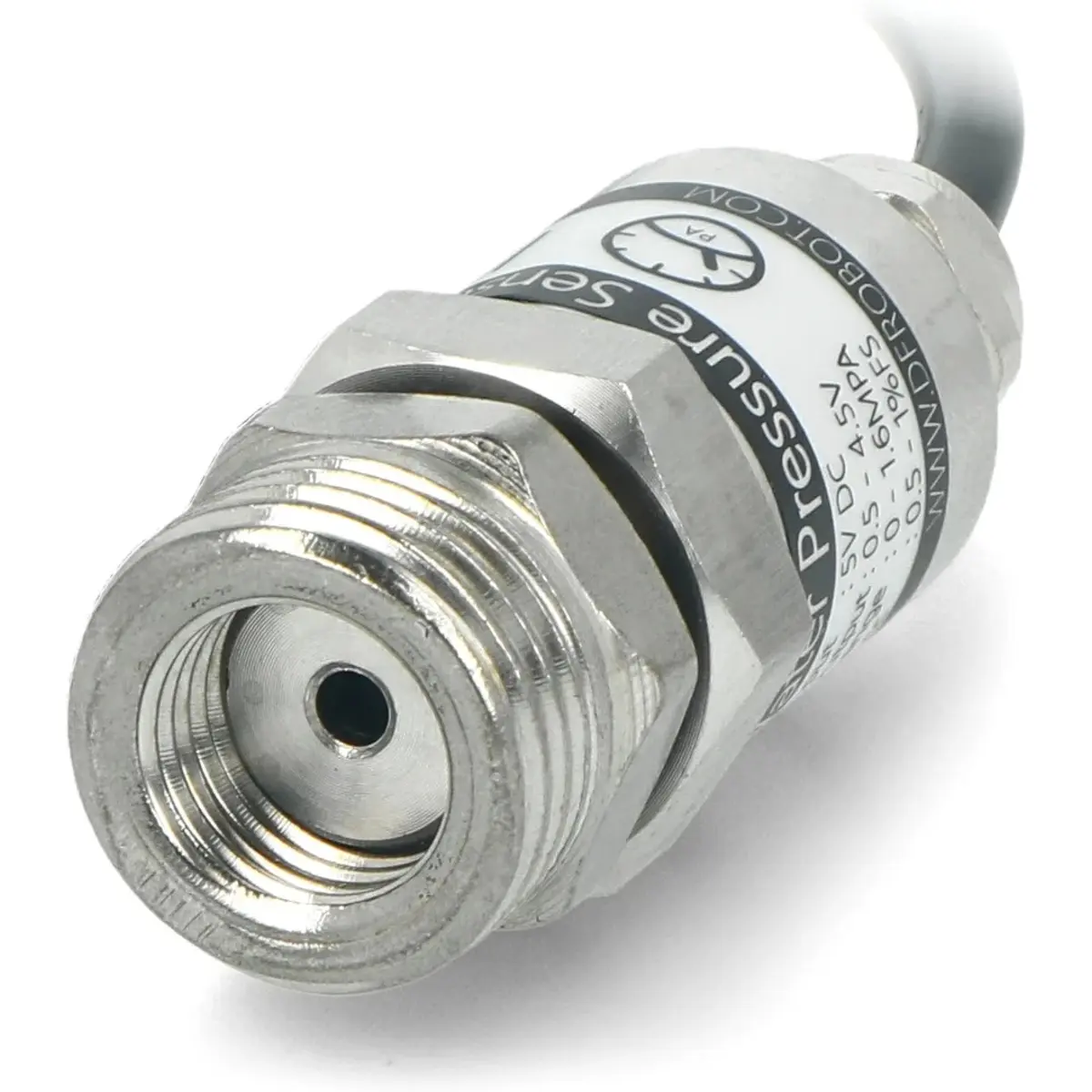 Sensor de pressão de água com saída analógica de 0,5-4,5 V para 0-1 MPa, alimentado a 5 VDC. Compatível com Arduino e outros controladores, possui ligação Gravity-3Pin (Sinal, VCC, GND) e rosca G1/4; corpo IP68, tempo de resposta <2 ms, corrente quiescente 2,8 mA e precisão de 0,5-1% FS (0-55 °C). Opera entre -20 °C e 85 °C com líquidos/gases não corrosivos; adaptador G1/2 para G1/4 incluído.