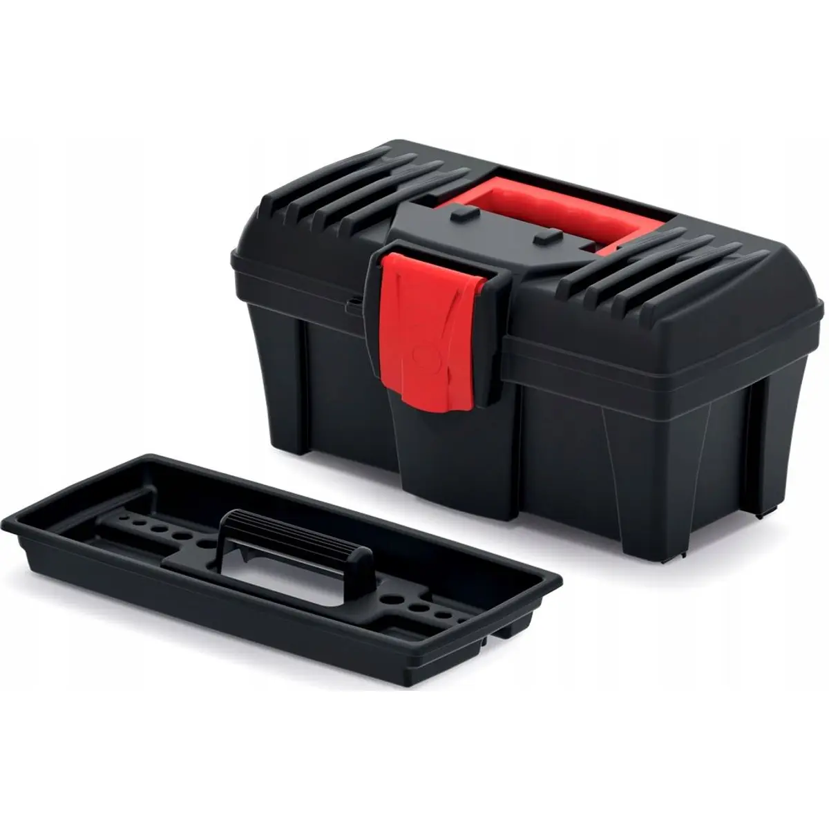 Caixa de ferramentas pequena em polipropileno com divisória removível para dois compartimentos, dimensões 300 x 167 x 150 mm e capacidade de carga de 6,0 kg. Possui punho e fechos em vermelho, e combina as cores preto e vermelho para maior visibilidade. Adequada para organização de ferramentas em casa ou no local de trabalho, oferece leveza, resistência e transporte fácil.