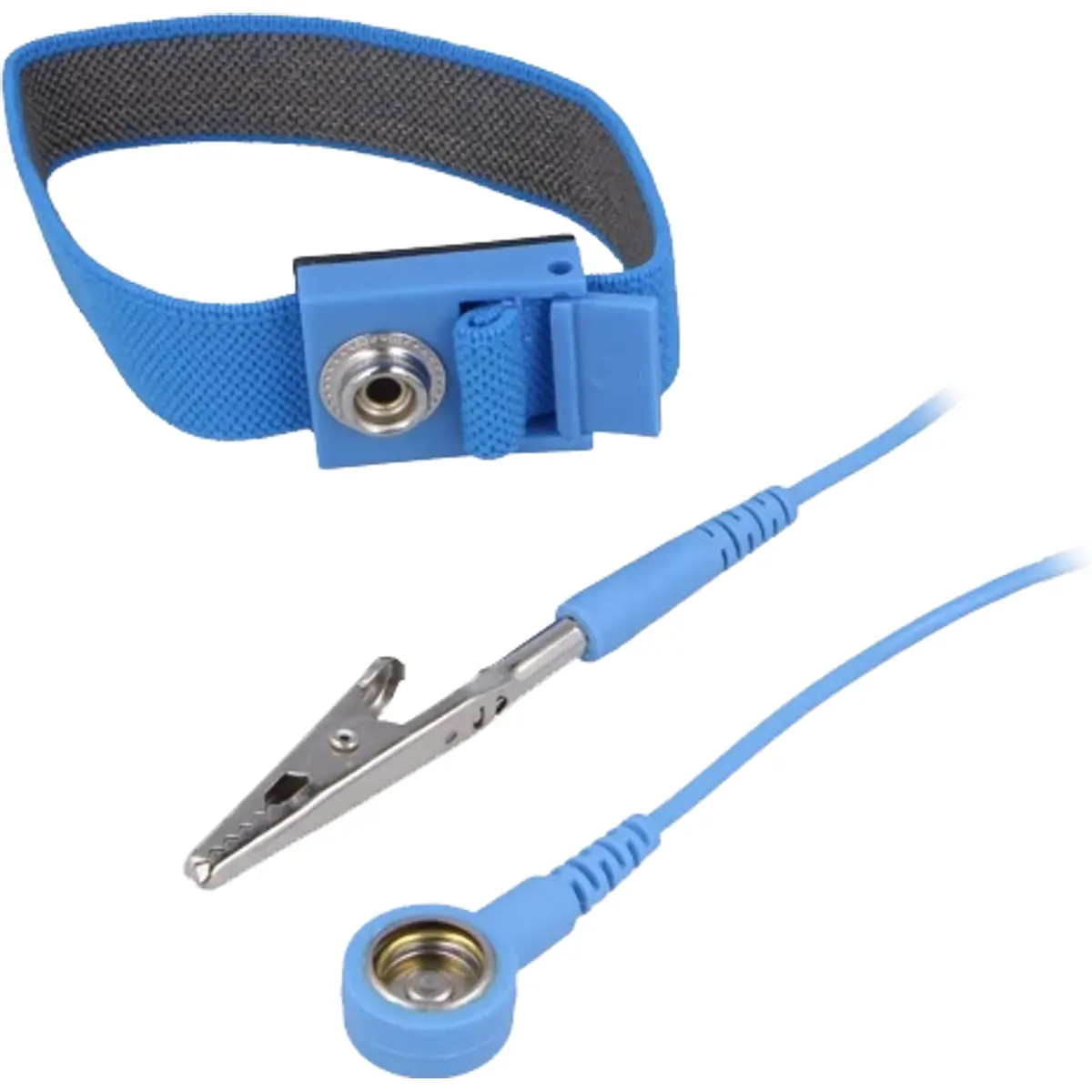 Pulseira anti-estática ajustável com cabo de 1,8 m, em azul, para aterramento seguro em ambientes de eletrónica. Possui terminais de cabo com trinco fêmea de 10 mm e travão macho de 10 mm, versão ESD e material antialérgico para uso prolongado. Ideal para montagem, laboratórios e manutenção de PCB, prevenindo descargas estáticas e protegendo componentes sensíveis.