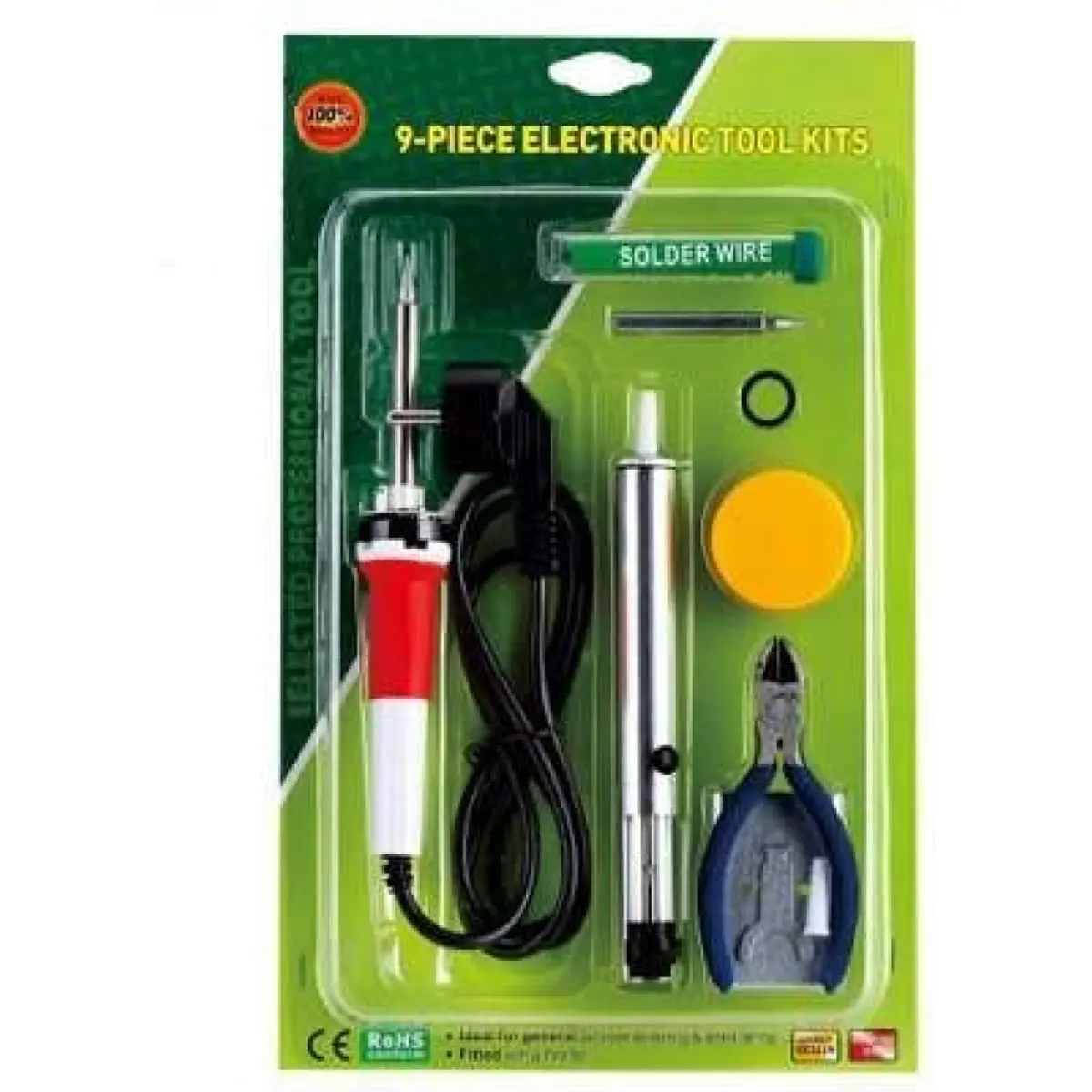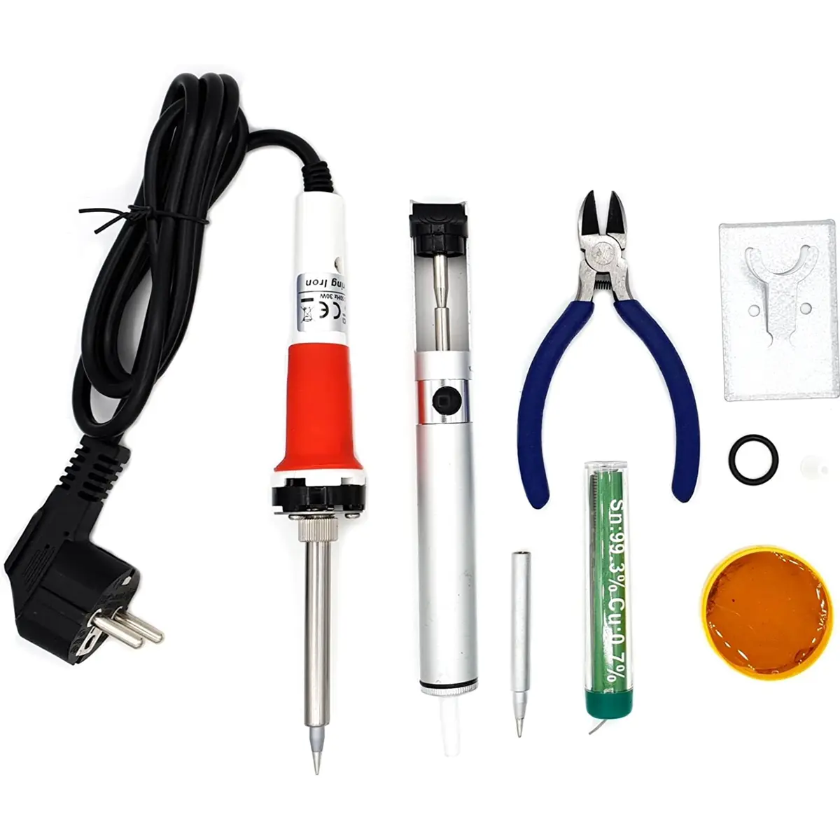 Kit de soldagem completo com ferro de soldar 30W, bomba dessoldadora e fluxo de solda, ideal para reparações eletrónicas e trabalhos de precisão. Inclui ponta sobressalente C1-1, bocal sobressalente, O-ring sobressalente, alicate de corte, suporte de ferro de soldar e fio de estanho.