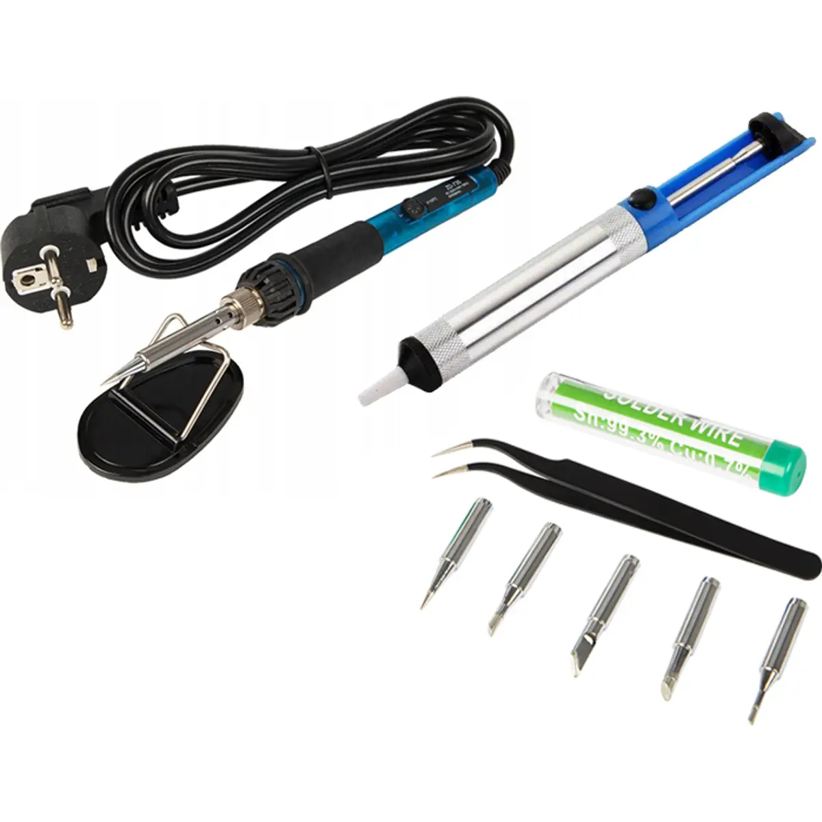 Kit de soldadura que inclui ferro de soldar de 60W, cinco pontas sobressalentes, bomba dessoldadora, pinça curva ESD, suporte para ferro e fio de estanho. Este conjunto completo facilita trabalhos de solda, montagem de circuitos e reparações, fornecendo ferramentas essenciais num único kit. Ideal para iniciantes e profissionais, permite realizar juntas de solda precisas e seguras com organização e praticidade no posto de trabalho.