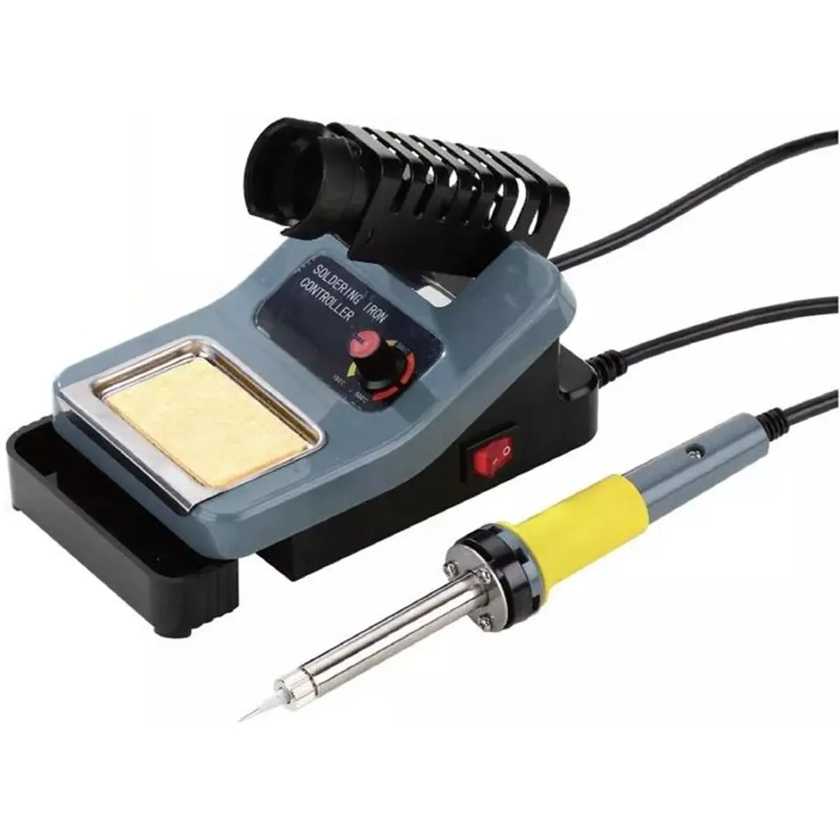 Estação de soldadura analógica com controlo de temperatura de 160-480°C, potência de 48W e ajuste rotativo por botão. O design compacto facilita o manuseio, enquanto o indicador de potência LED permite monitorizar o estado da soldadura. Ideal para trabalhos de soldadura com PCB e componentes pequenos, adequado para oficinas de hobby ou profissionais que procuram uma solução simples e acessível. Palavras-chave: temperatura ajustável, 160-480°C, potência 48W, ajuste rotativo, indicador LED, design compacto.