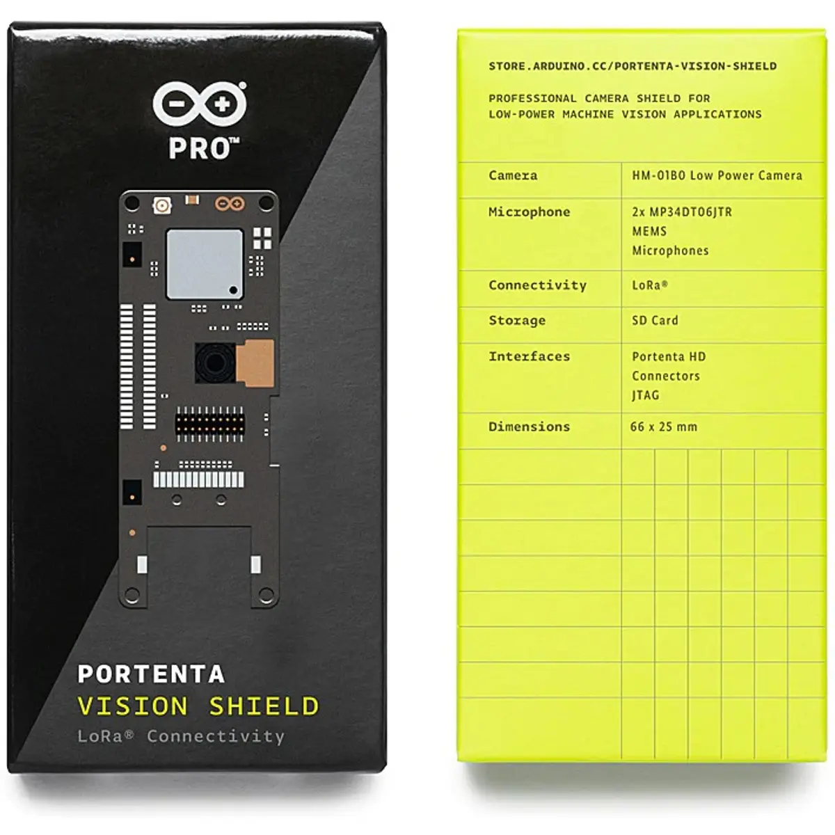 O Arduino Portenta Vision Shield LoRa® é uma placa de "addon" que fornece capacidades de Machine Vision e conectividade adicional à família de placas Portenta da Arduino.