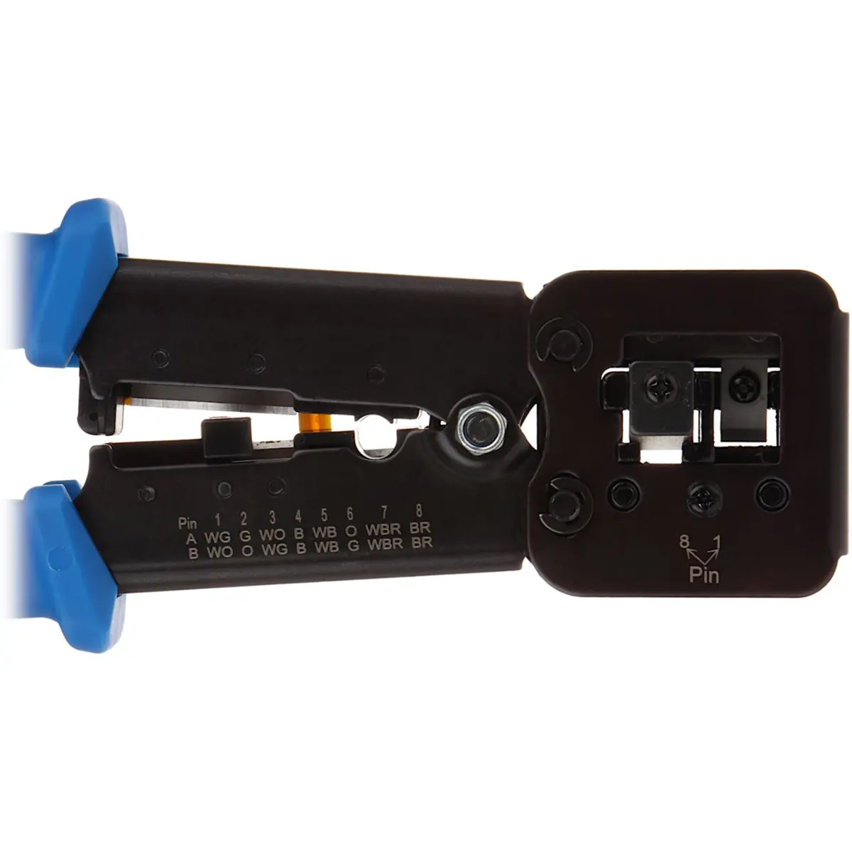 Alicate de cravar fichas RJ11, RJ12 e RJ45 de tecnologia passante, com 210 mm de comprimento. Permite cravar e cortar os pares em fichas 8P8C, 6P6C, 6P4C e 6P2C, com lâminas de corte e descarnador de cobertura exterior com proteção de segurança. Compatível com fichas RJ11, RJ12 e RJ45 convencionais, oferecendo acabamento limpo e fiável para instalações de redes.