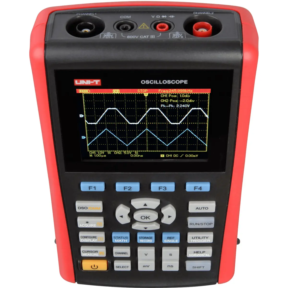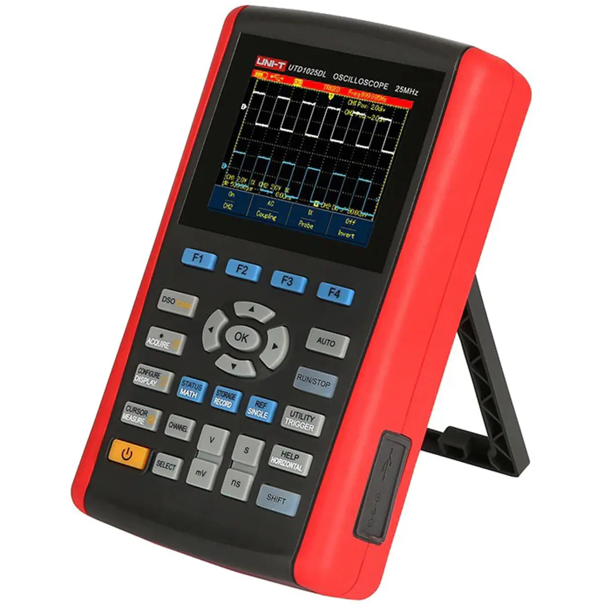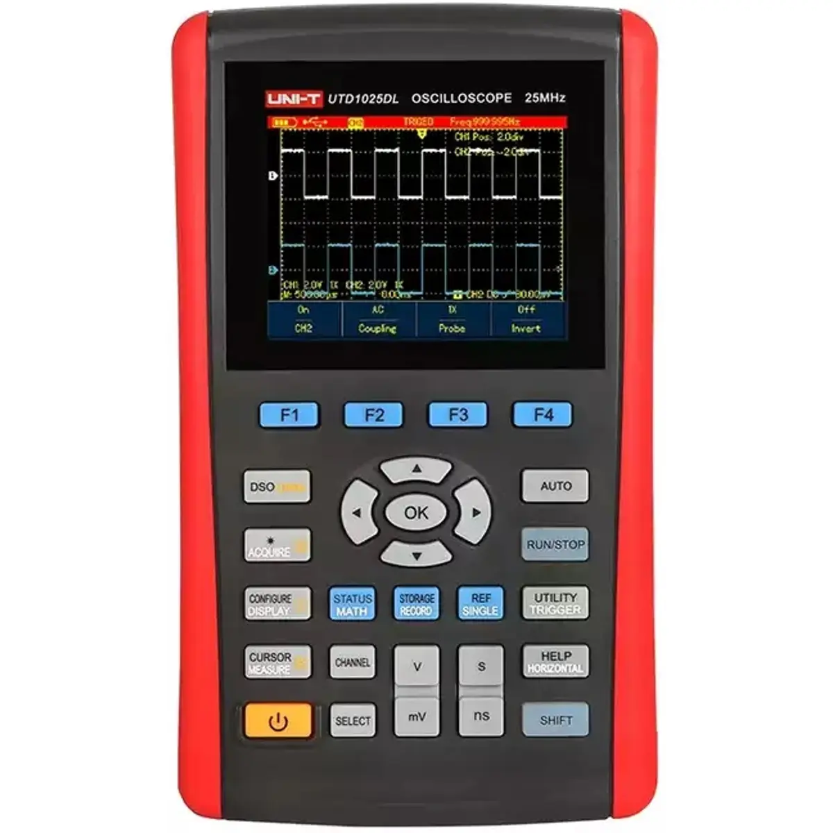 O UTD1025DL é um osciloscópio/multímetro portátil que possui dois canais com largura de banda de 25 MHz, uma taxa de amostragem de 250 MS/s e função de registo de formas de onda. Além disso, tem as funcionalidades típicas de um multímetro True-RMS, com medição de voltagem, corrente, resistência, capacitância, díodos, continuidade; mostrando valores até 3999.