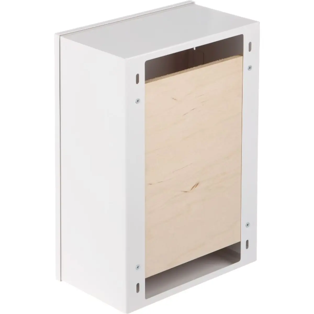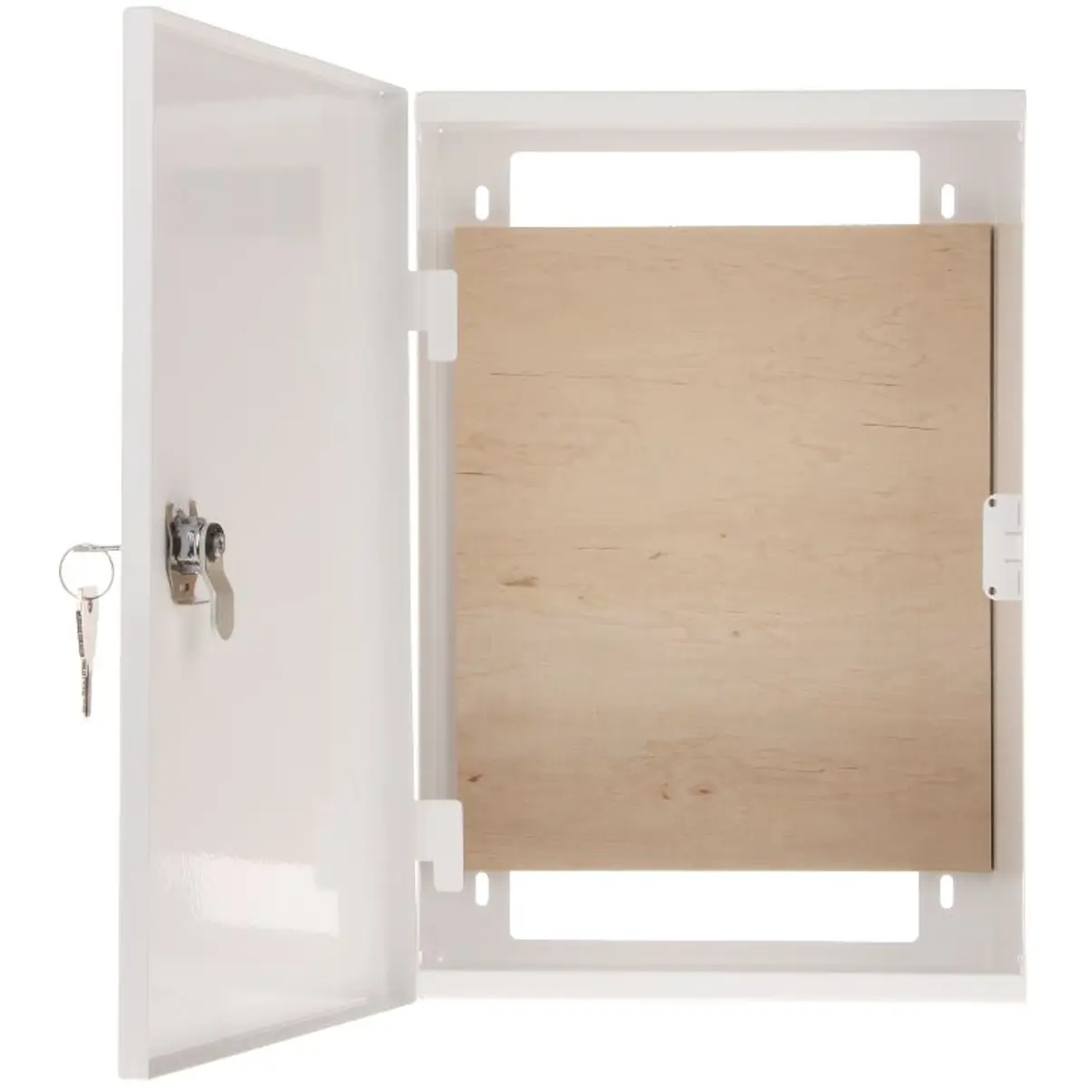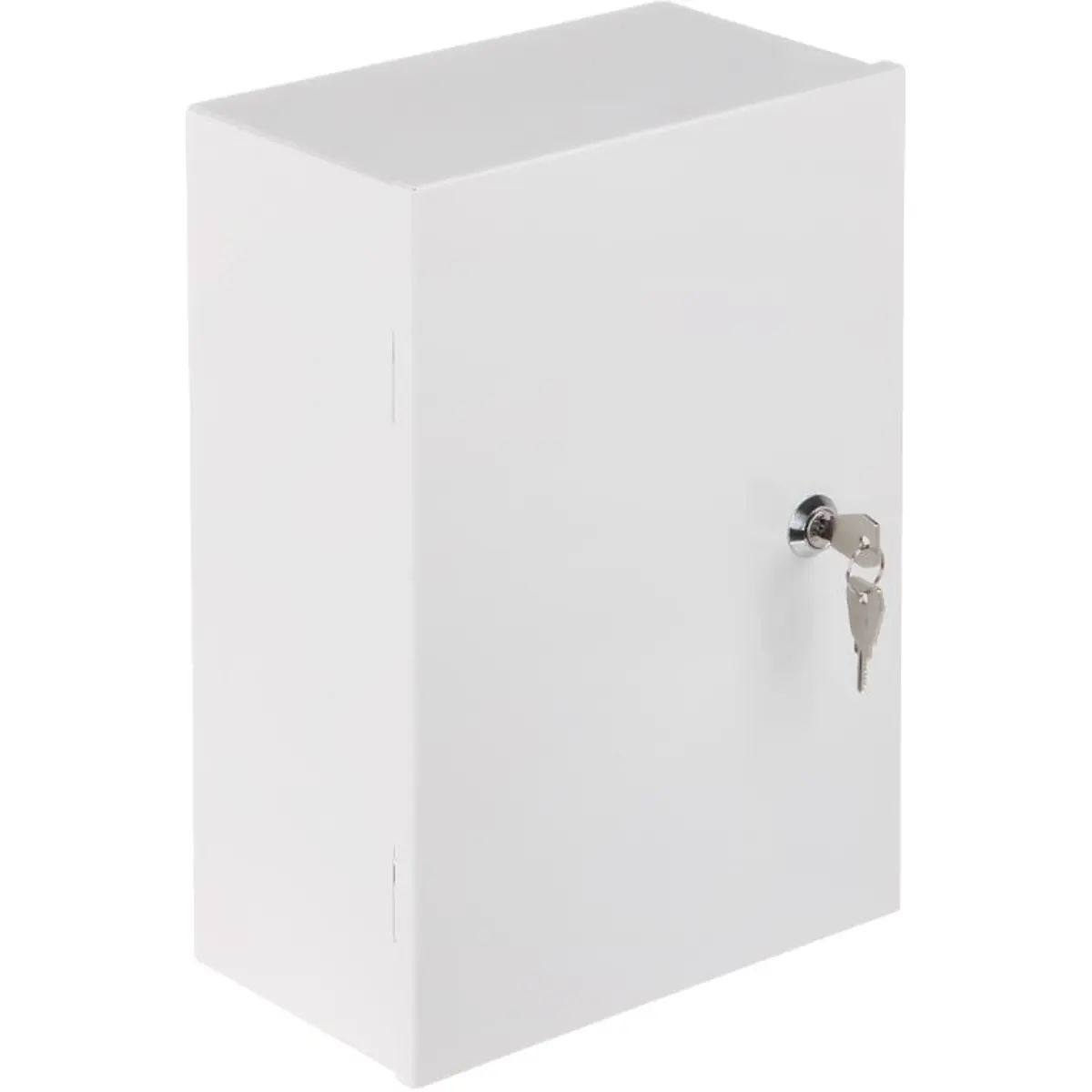 Caixa metálica de montagem saliente com acabamento branco RAL9003, revestida a pó para maior durabilidade. A placa de montagem em madeira permite fixação estável. Inclui 2 chaves para travamento. Dimensões externas 200 x 300 x 120 mm e internas 175 x 275 x 97 mm, peso 1,32 kg. Adequada para armazenamento seguro em oficinas, garagens ou armazéns, oferecendo proteção contra poeira e impactos leves, com acesso rápido e fácil colocação em parede ou bancada.