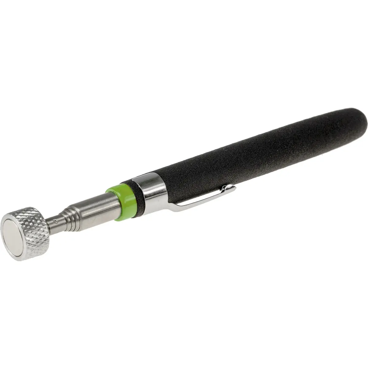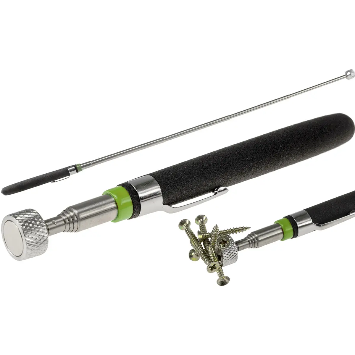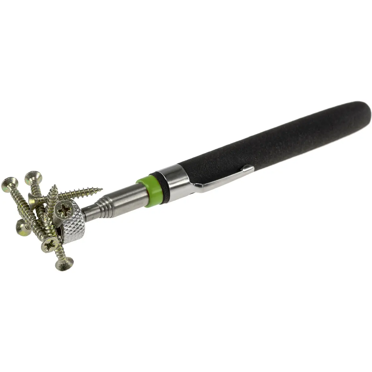 Este íman com haste telescópica permite recolher peças metálicas em locais de difícil acesso. Extensível de 16 cm a 61 cm, com braço telescópico e clipe para cinto para maior mobilidade. O punho de borracha oferece uma fixação segura, enquanto o íman de Ø14 mm possui força de tração até 2 kg. Pesando apenas cerca de 65 g, é leve, portátil e ideal para alcançar componentes no motor de automóveis, cozinhas ou casas de banho. Prático, compacto e de uso versátil.