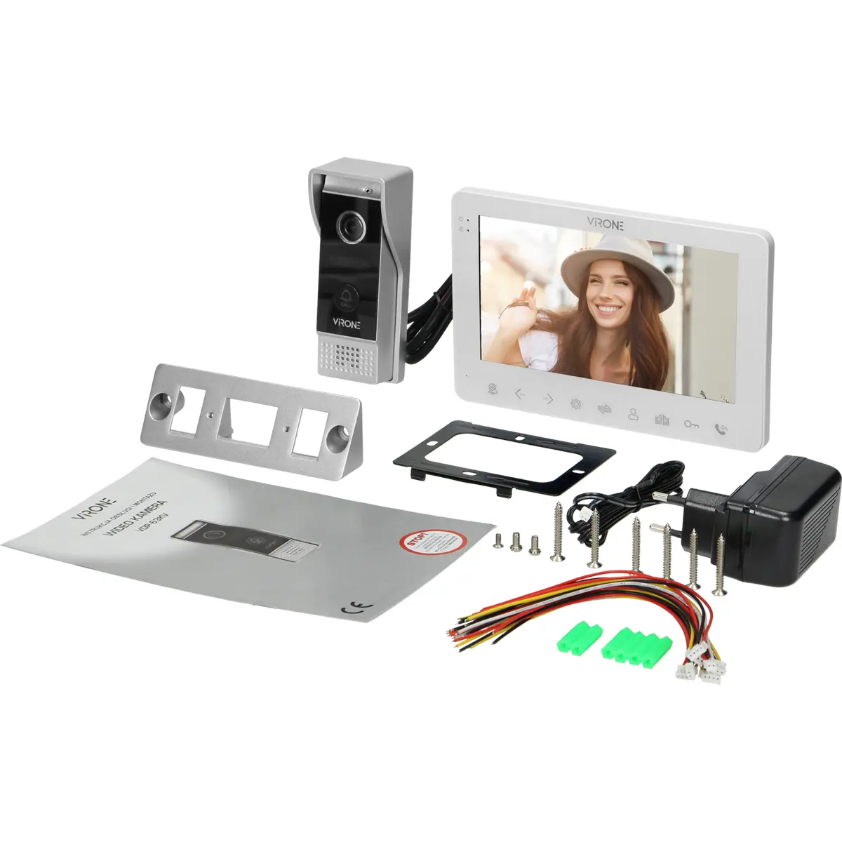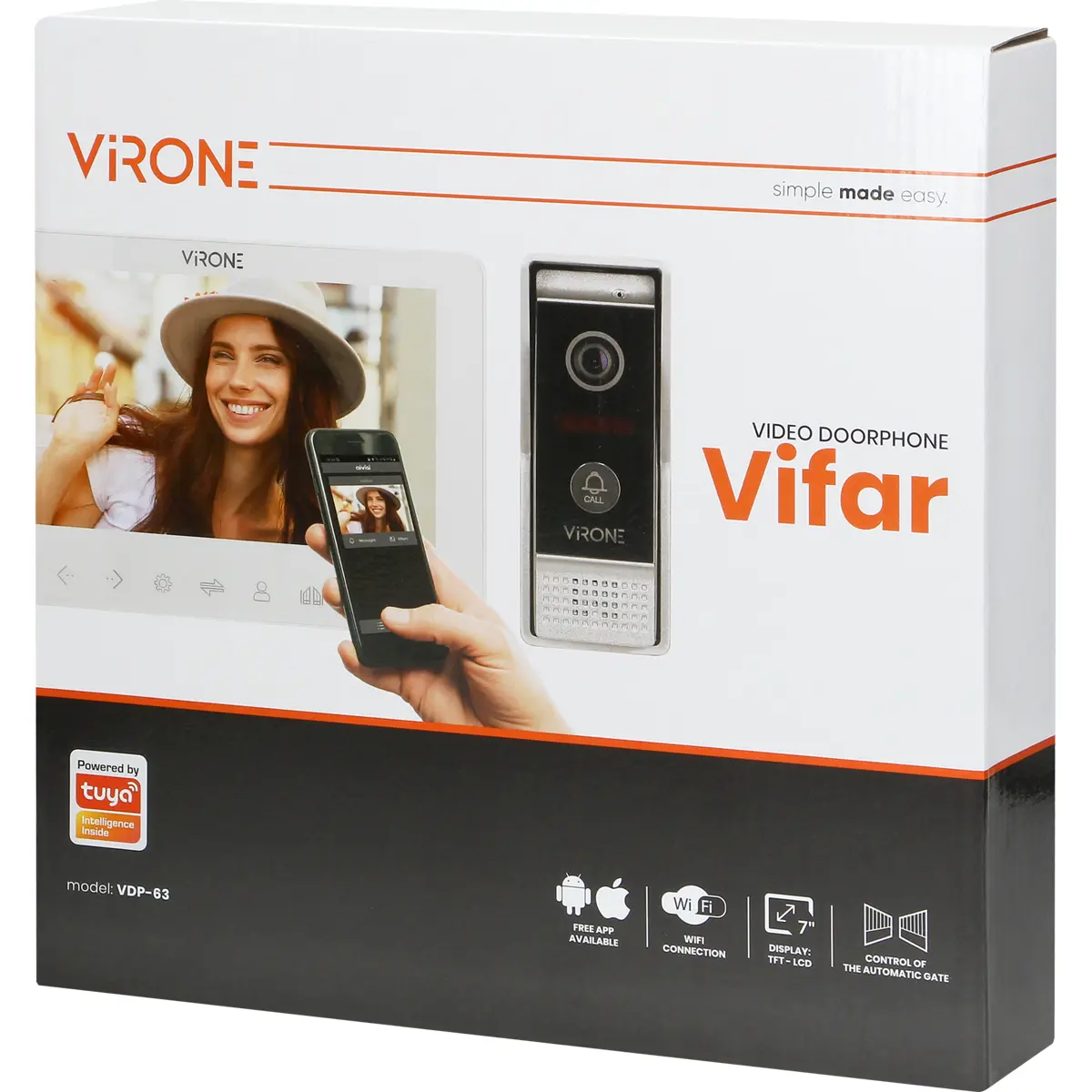 O moderno videoporteiro Vifar consiste num monitor LCD a cores de 7" branco e um painel externo com câmara e botão de entrada. A iluminação adicional do painel exterior com LEDs IR permite uma boa visão nocturna. O conjunto está equipado com um slot de cartão Micro SD que lhe permite ver, gravar e guardar ficheiros de vídeo/foto da câmara, para que possa verificar quem o visitou, mesmo quando está ausente de casa.