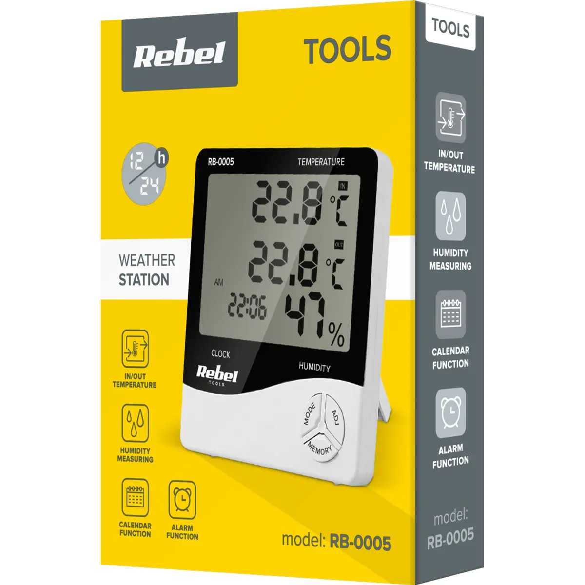 A estação meteorológica doméstica RB-0005 também foi equipada com funções adicionais. O dispositivo possui um calendário e um relógio com configuração de alarme , o que permitirá substituir o despertador tradicional. A grande vantagem da estação é que esta esta é sem fio, o que facilita colocá-la facilmente em qualquer lugar.