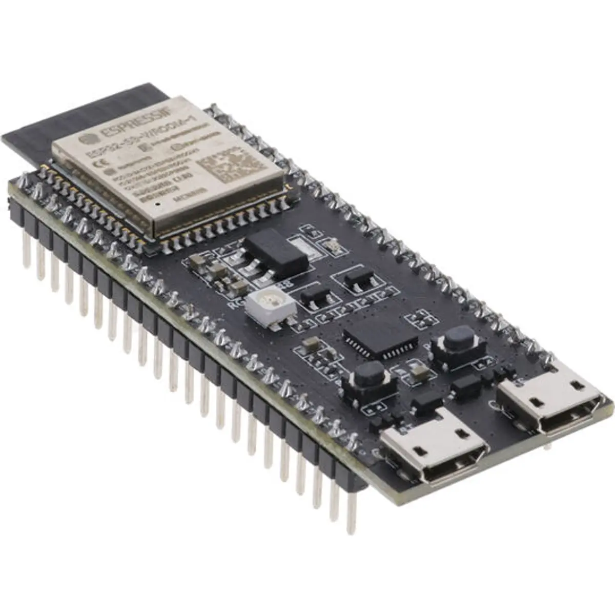 A placa ESP32-S3-DEVKITC-1-N8R8 da Espressif Systems foi concebida para aplicações de IoT, comunicação sem fios e projetos de prototipagem rápida. Integra o módulo ESP32-S3-WROOM-1-N8R8, combinando conectividade Wi-Fi 802.11 b/g/n e Bluetooth® 5.x (BLE) a 2,4 GHz, com memória Flash Quad SPI de 8 MB e RAM Octal SPI de 8 MB, ideal para tarefas de processamento e aplicações de controlo. Os pinos de I/O estão acessíveis através de cabeçalhos laterais, facilitando a ligação a periféricos ou breadboards.