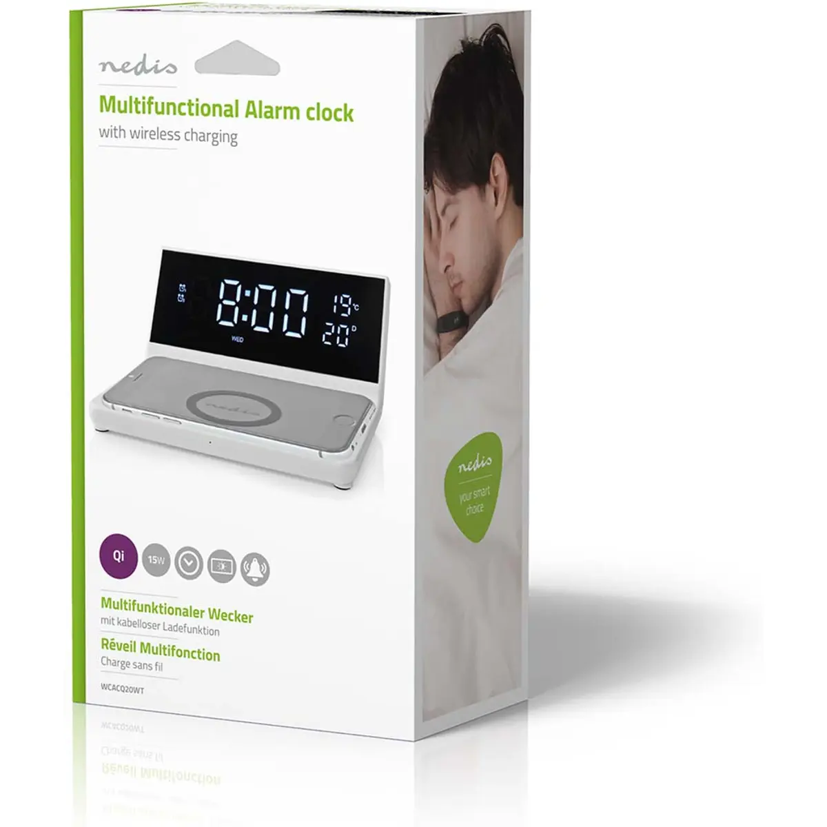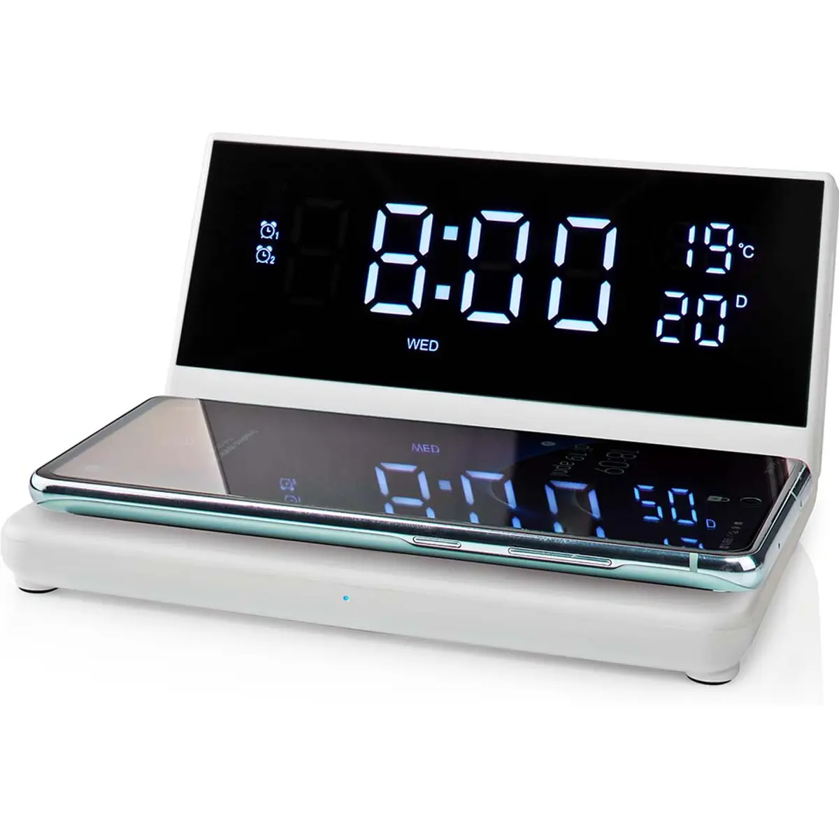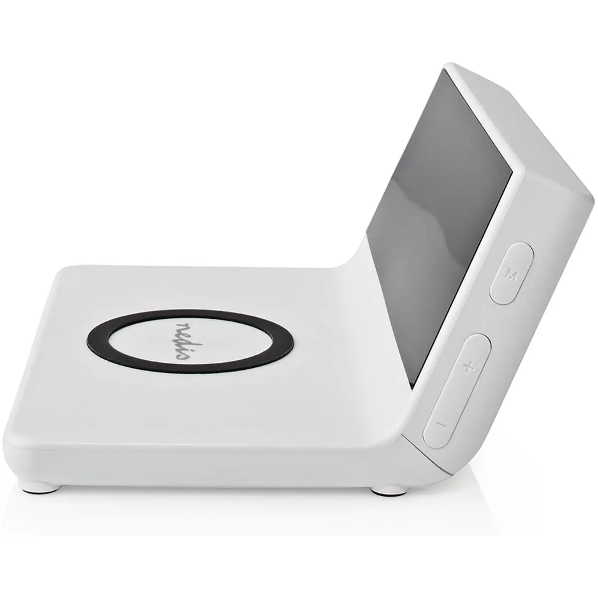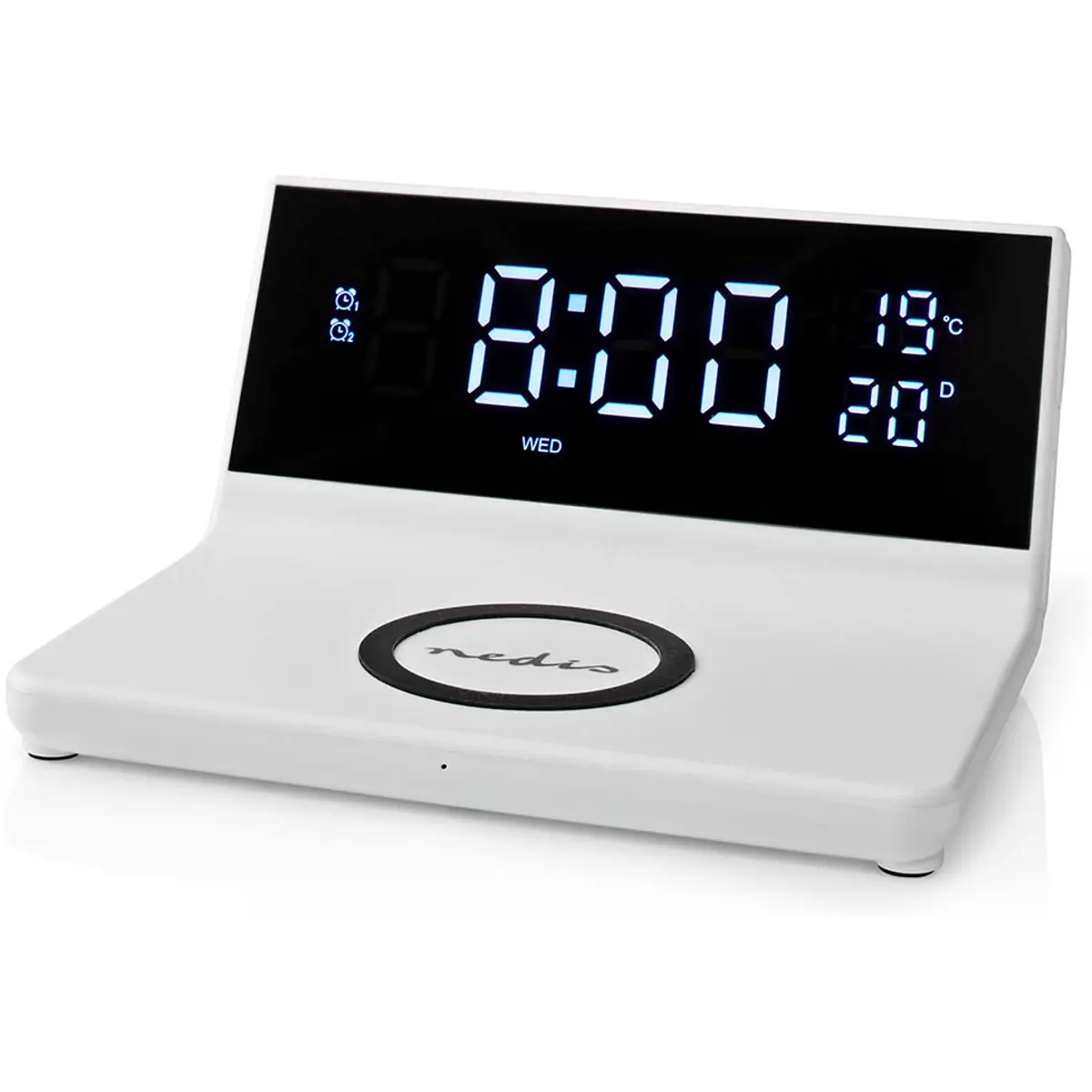 Com este despertador 3 em 1 da Nedis, você e o seu smartphone começarão a manhã totalmente recarregados, graças às suas três funções: carregamento sem fio Qi, relógio LED e função de alarme duplo.
