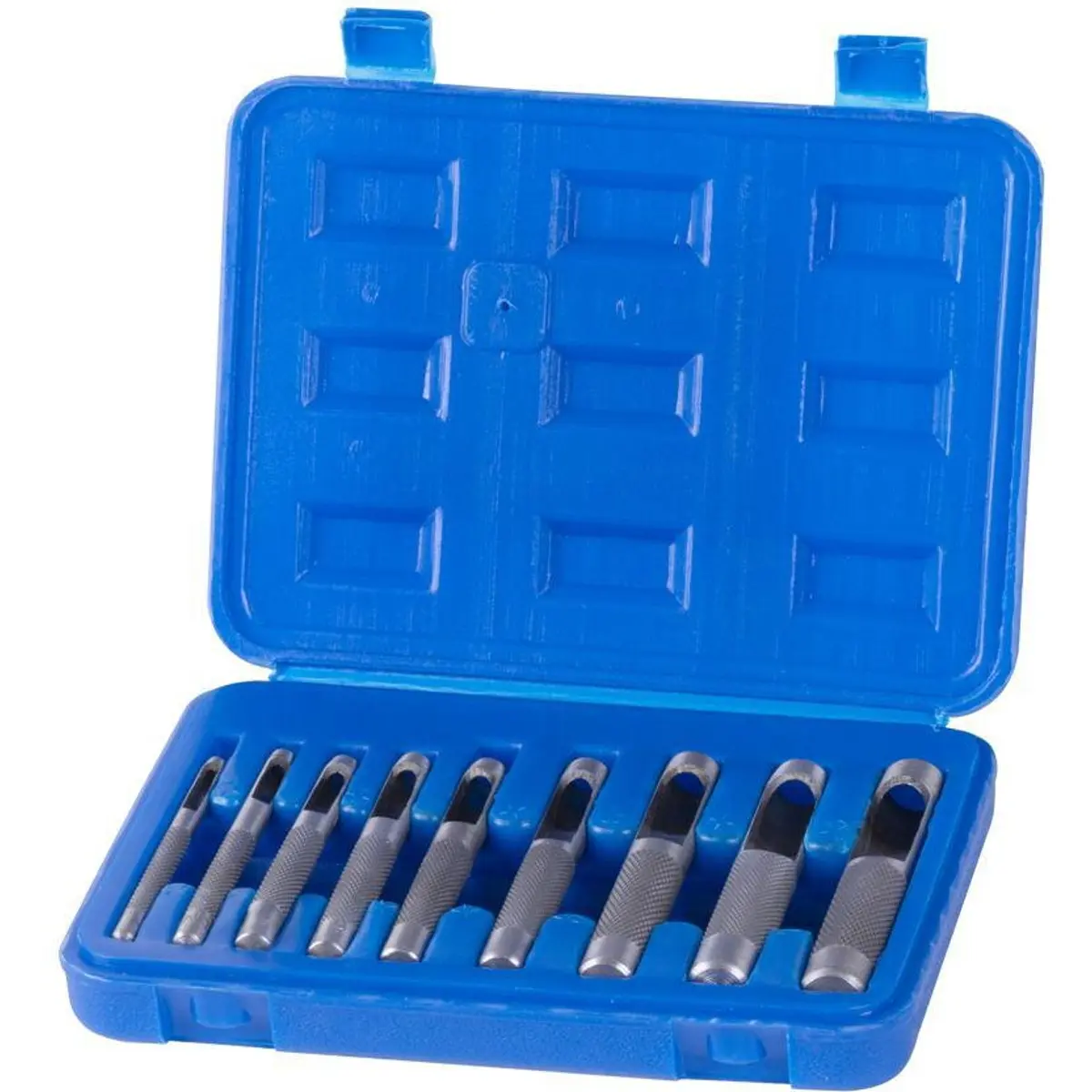 Conjunto de vazadores de pancada para fazer furos precisos em couro e borracha. Com 9 punções, diâmetros de 3, 4, 5, 6, 7, 8, 10, 11 e 12 mm. Este kit oferece opções para diferentes espessuras, ideal para artesanato, calçado, acessórios e reparações, garantindo furos limpos e consistentes. Perfeito para trabalhos manuais que exigem precisão, com fácil manuseio e organização em estojo.