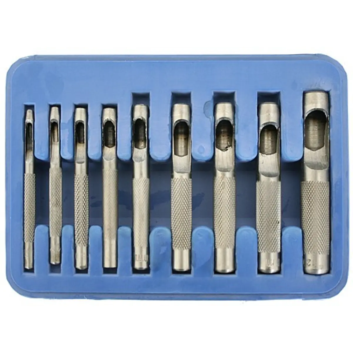 O conjunto é composto por 9 punções com diâmetro de 3, 4, 5, 6, 7, 8, 10, 11, 12mm