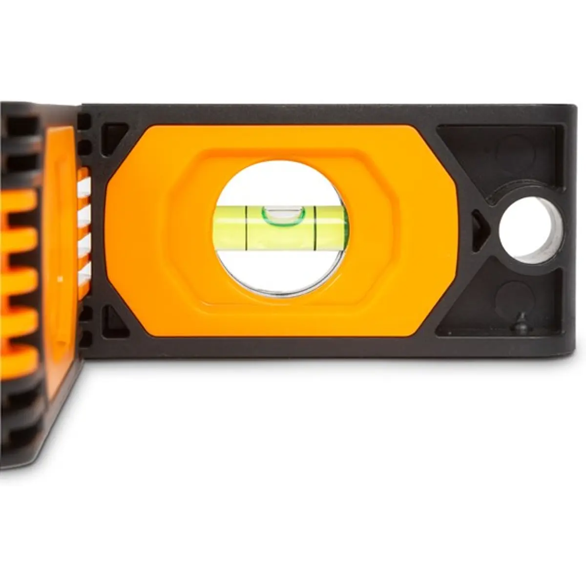 Este nível de bolha pode ser dobrado em 8 pontos, nos quais inclui 4 bolhas de nível calibrados. 2 níveis de bolha nas extremidades para medições horizontais,1 no centro para medições verticais e outro para ângulos de 45 °.