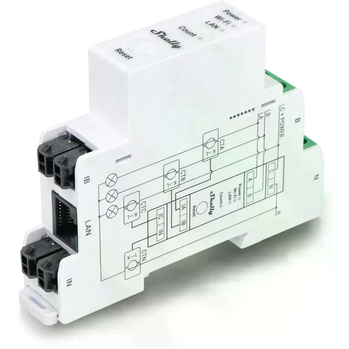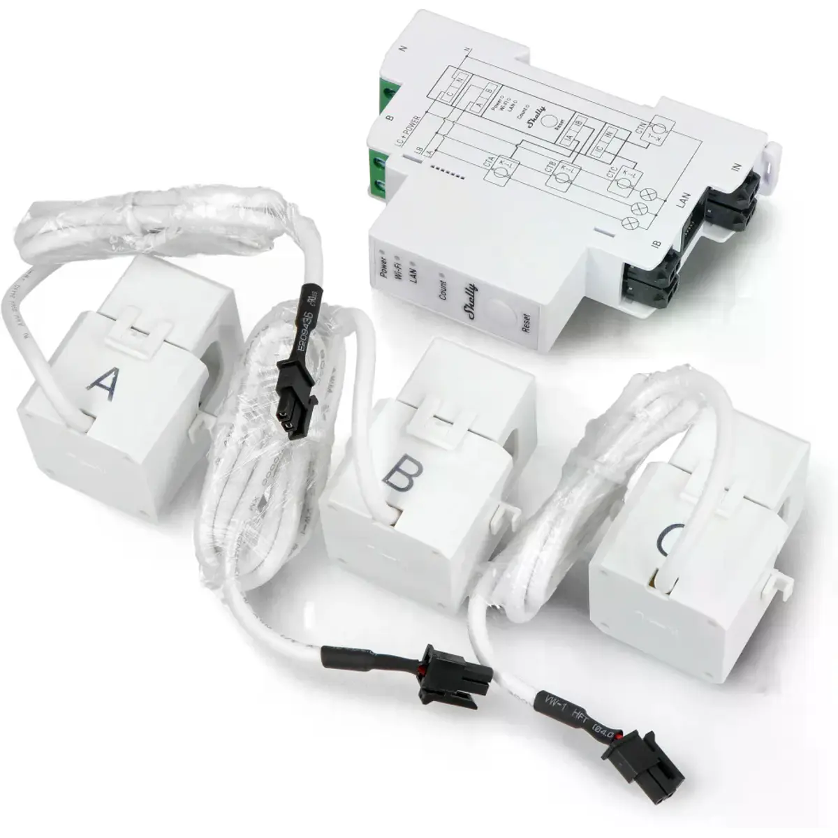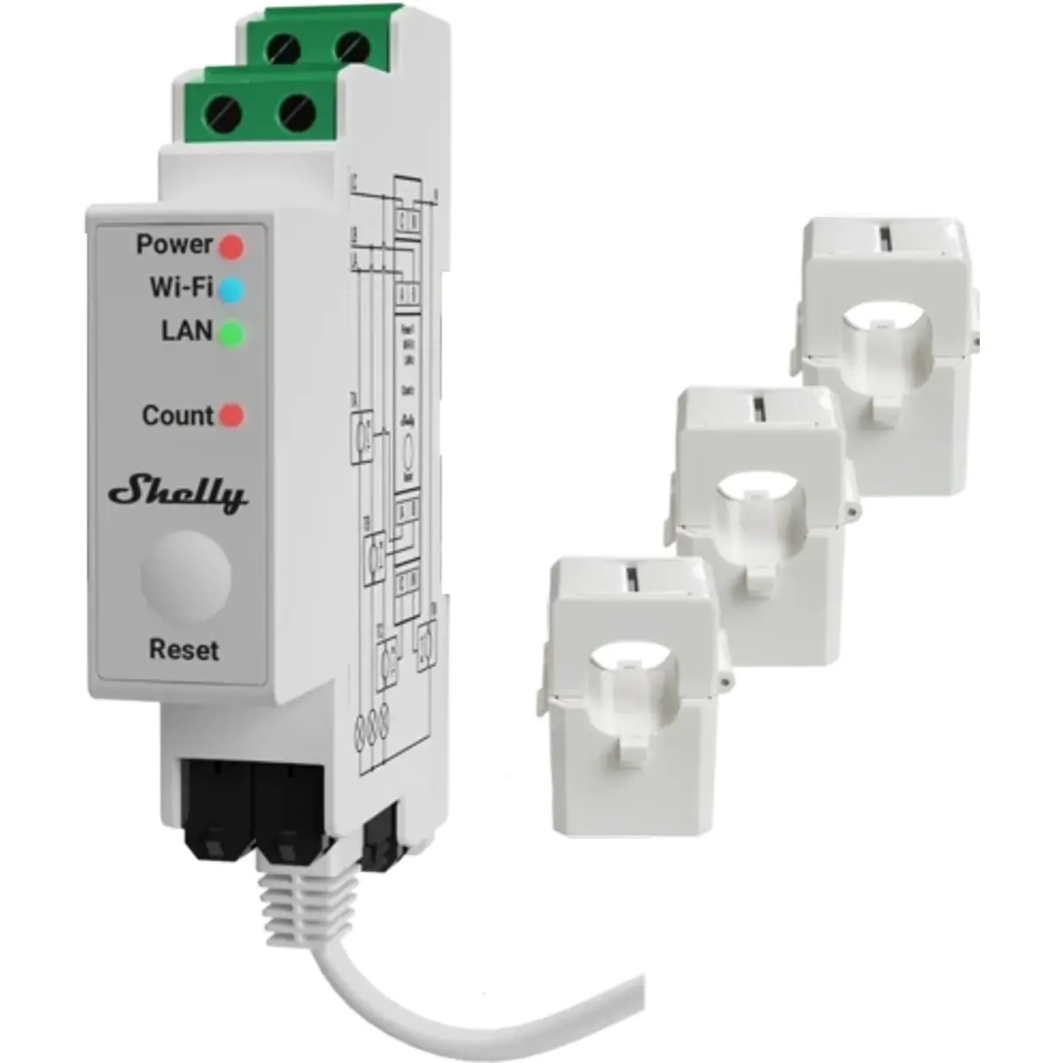O Shelly Pro 3EM é um medidor de energia trifásico, montável em calha DIN, que utiliza transformadores de intensidade de corrente (de núcleo aberto) para medir a energia em três fases individuais, com cargas até 120A e com 99% de precisão.