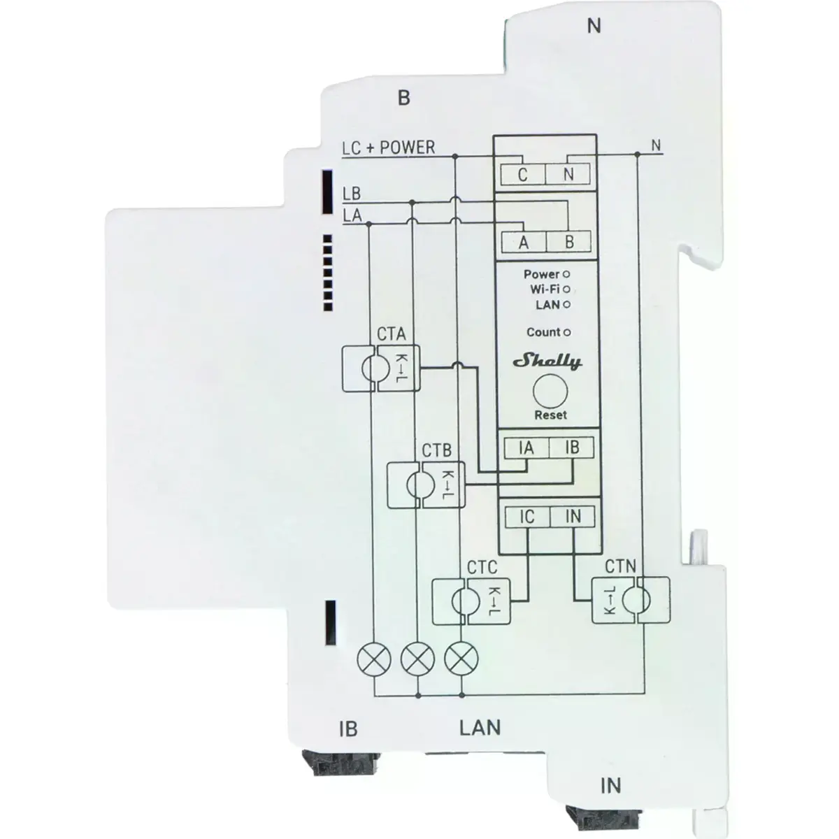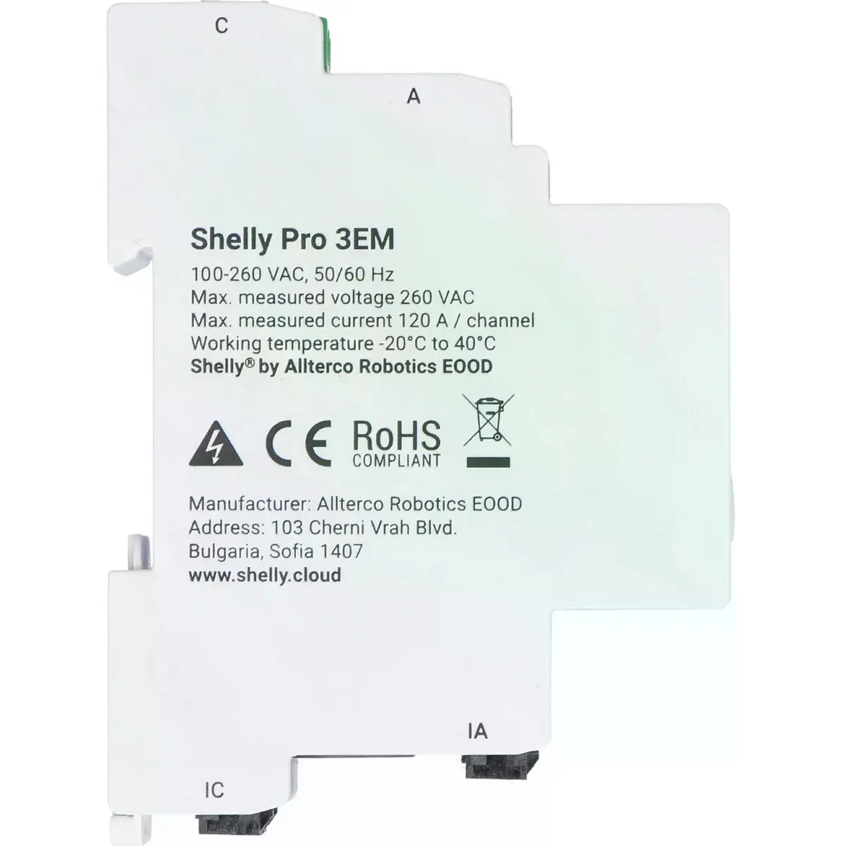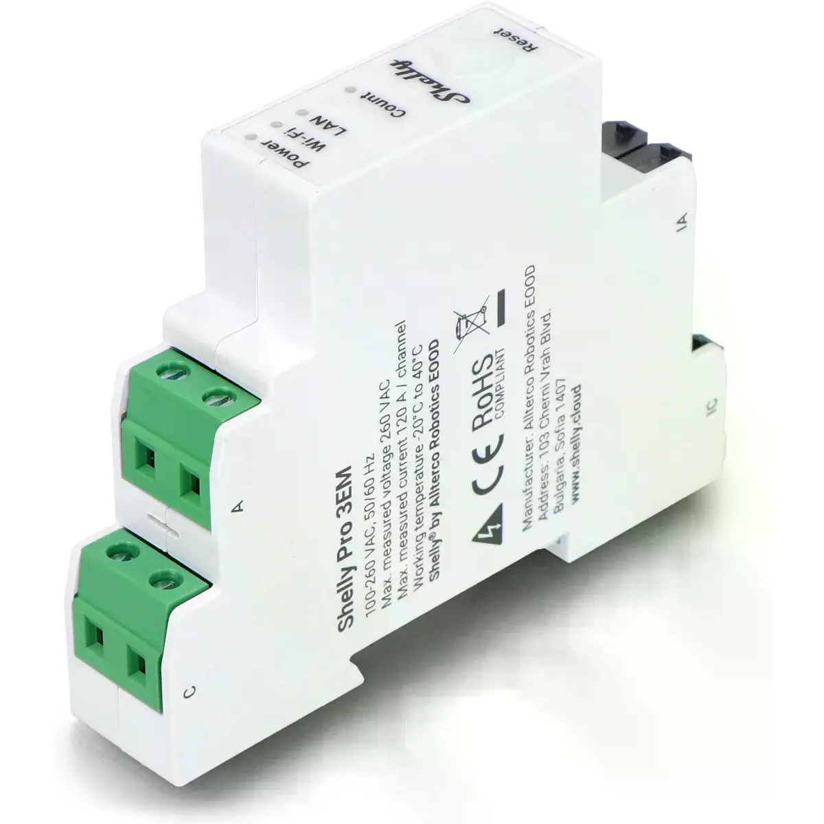 O Shelly Pro 3EM é um medidor de energia trifásico, montável em calha DIN, que utiliza transformadores de intensidade de corrente (de núcleo aberto) para medir a energia em três fases individuais, com cargas até 120A e com 99% de precisão.