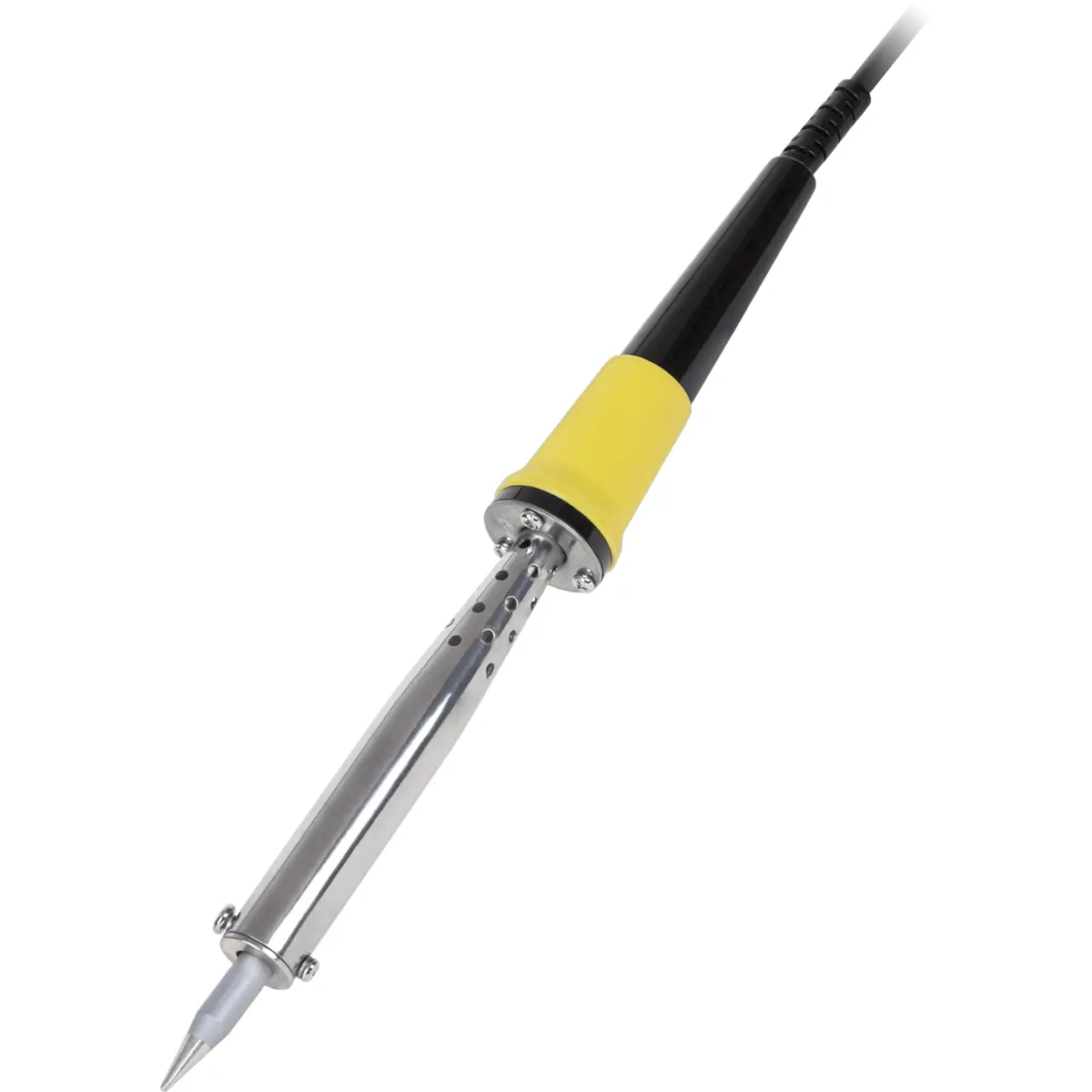 Ferro de soldar com alimentação entre 220 e 240 V e 50 Hz, potência de 100 W. Este equipamento apresenta especificações básicas para tarefas de soldadura, compatível com redes elétricas padrão, e facilita trabalhos de montagem e reparação com uma operação simples e direta.