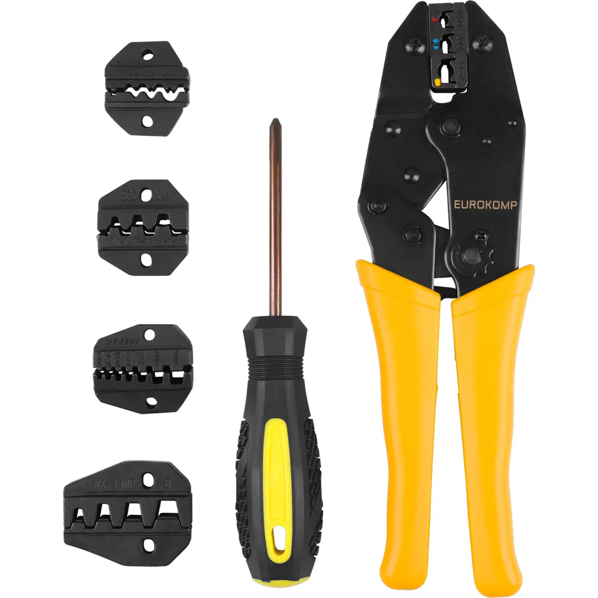 Este prático kit é indefensável para quem crave muitos tipos de terminais e cabos. As 5 garras de fixação diferentes podem ser substituídas rapidamente graças à chave incluída. O conjunto é guardado em uma prática bolsa de ferramentas.
