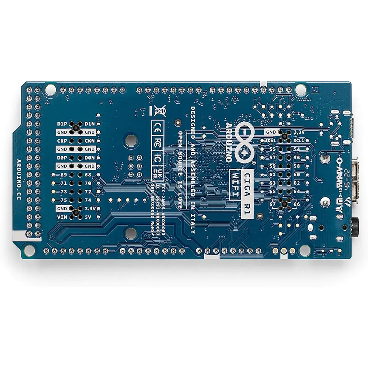 ● GPIOs e pinos extra: possui o mesmo fator de forma do Mega e do Due, para que possa facilmente adaptar os seus shields existentes ao GIGA R1 WiFi (lembre-se que esta placa funciona a 3.3V!). Para além disso foram adicionados cabeçalhos para poder aceder aos pinos extra, elevando a contagem total para 76 pinos GPIO, e a melhor parte, pode aceder a eles por baixo, por isso poderá manter um antigo projeto como está e pense apenas em como expandi-lo. Além disso, possui dois novos pinos: um VRTC para que possa ligar uma bateria para manter o RTC a funcionar enquanto a placa está desligada e um pino OFF para que possa desligar a placa.
