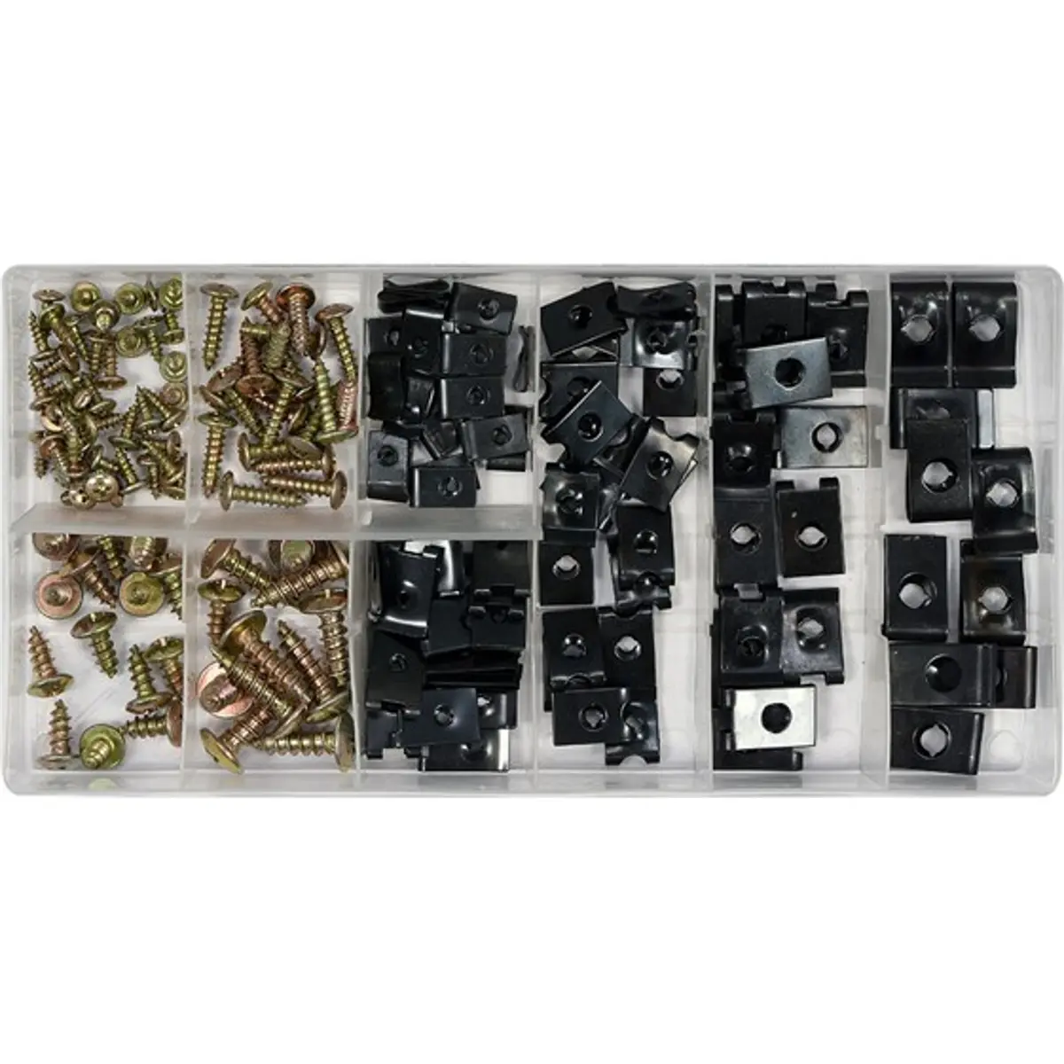 Conjunto de fixação automóvel com clips metálicos em U e parafusos universais. Inclui 170 peças: parafusos nos tamanhos M3x8, M4x16, M5x12 e M6x20, além de clips em U nos tamanhos M3, M4, M5 e M6. Ideal para montagem, fixação de cablagens e componentes interiores em automóveis, oferecendo opções de ajuste e compatibilidade. As peças em metal garantem durabilidade e resistência, com organização prática para reposição rápida. Perfeito para trabalhos de manutenção, reparação e personalização de painéis, suportes e fiações automotivas.