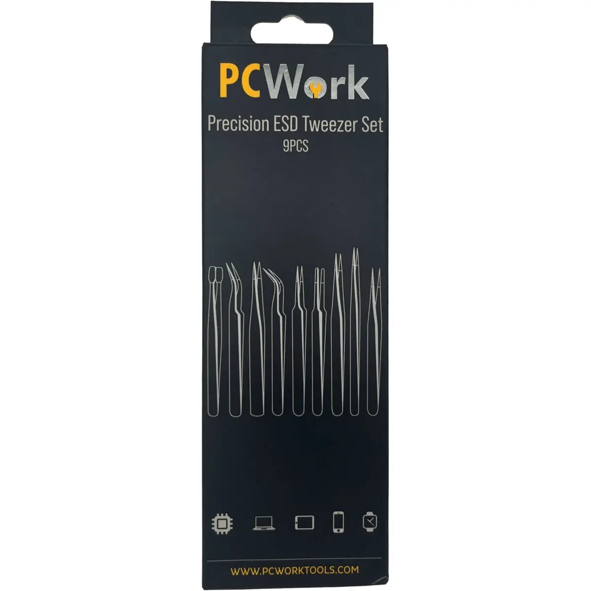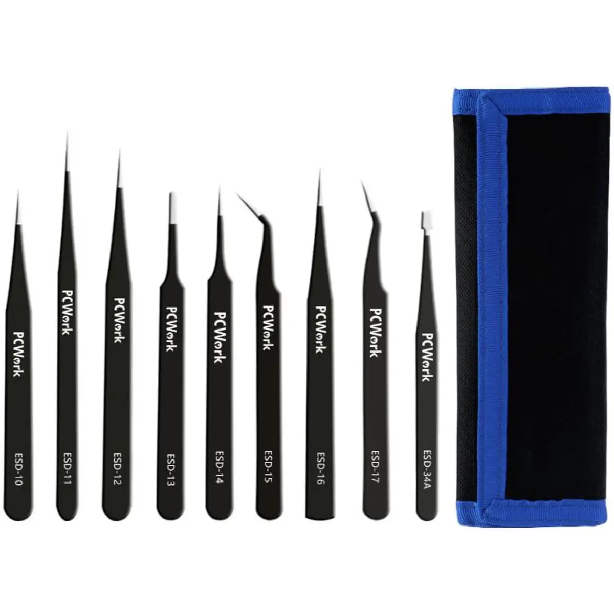 O Kit PCW08G é um conjunto de 9 pinças de aço inoxidável ESD-Safe, ideal para trabalhar com componentes eletrónicos sensíveis.