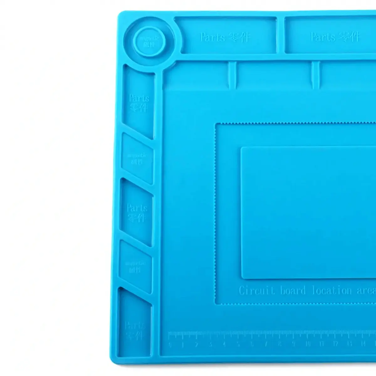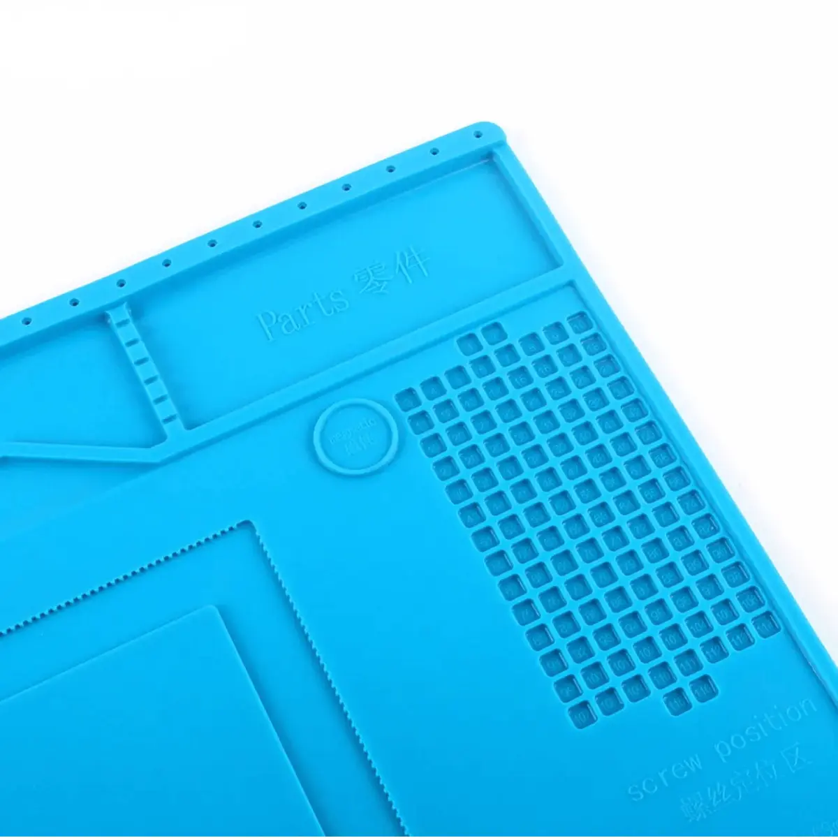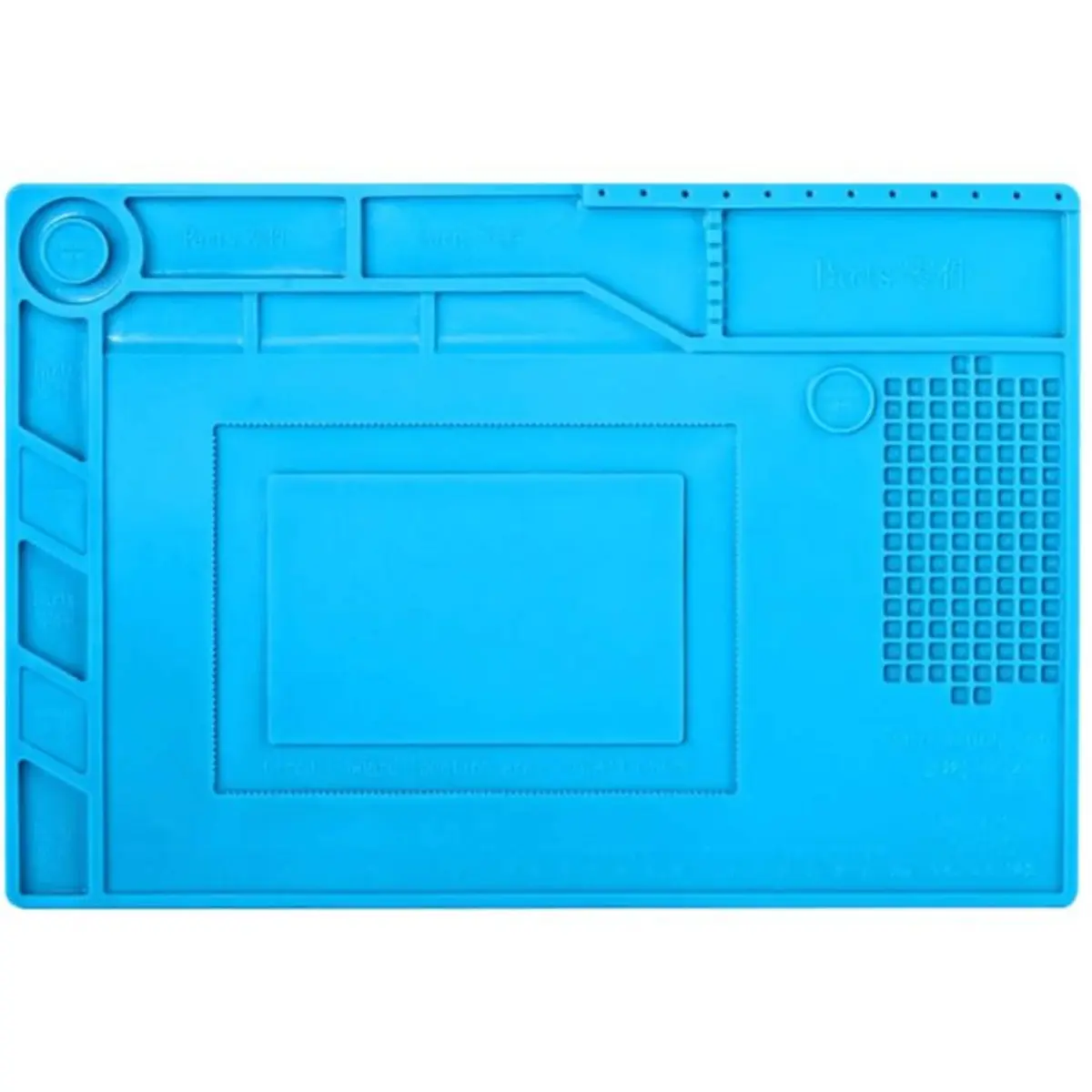 Tapete em silicone anti-estático com ímanes integrados para segurar peças com precisão. Resiste a temperaturas de até 450°C e mede 390x270 mm, com rebordo de 6,5 mm para evitar que peças caiam. O padrão de grelha e régua facilita medições e organização durante reparações de telemóveis, eletrónica em geral e joias. Ideal para proteger a bancada contra arranhões e danos durante soldagem e trabalhos de reparação.