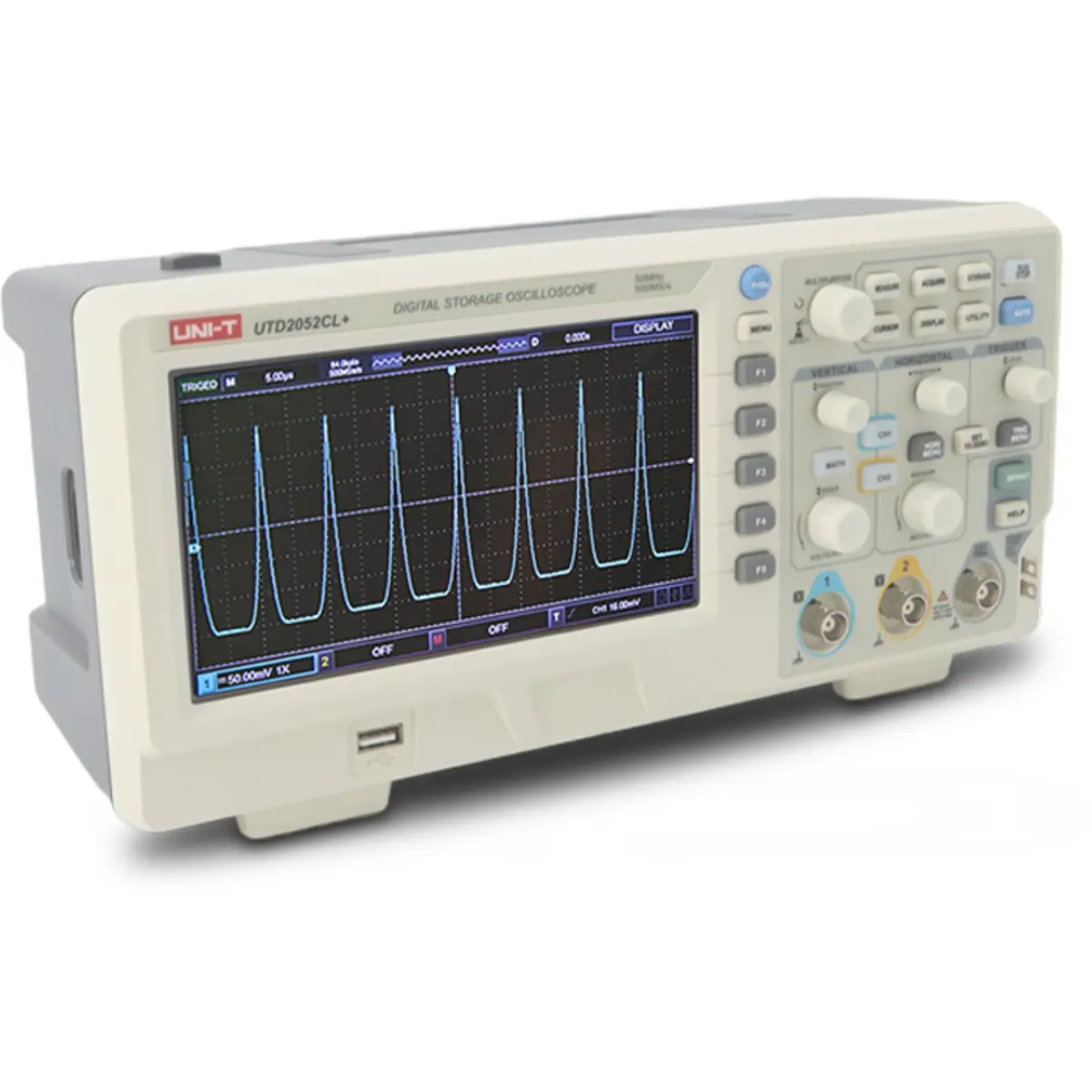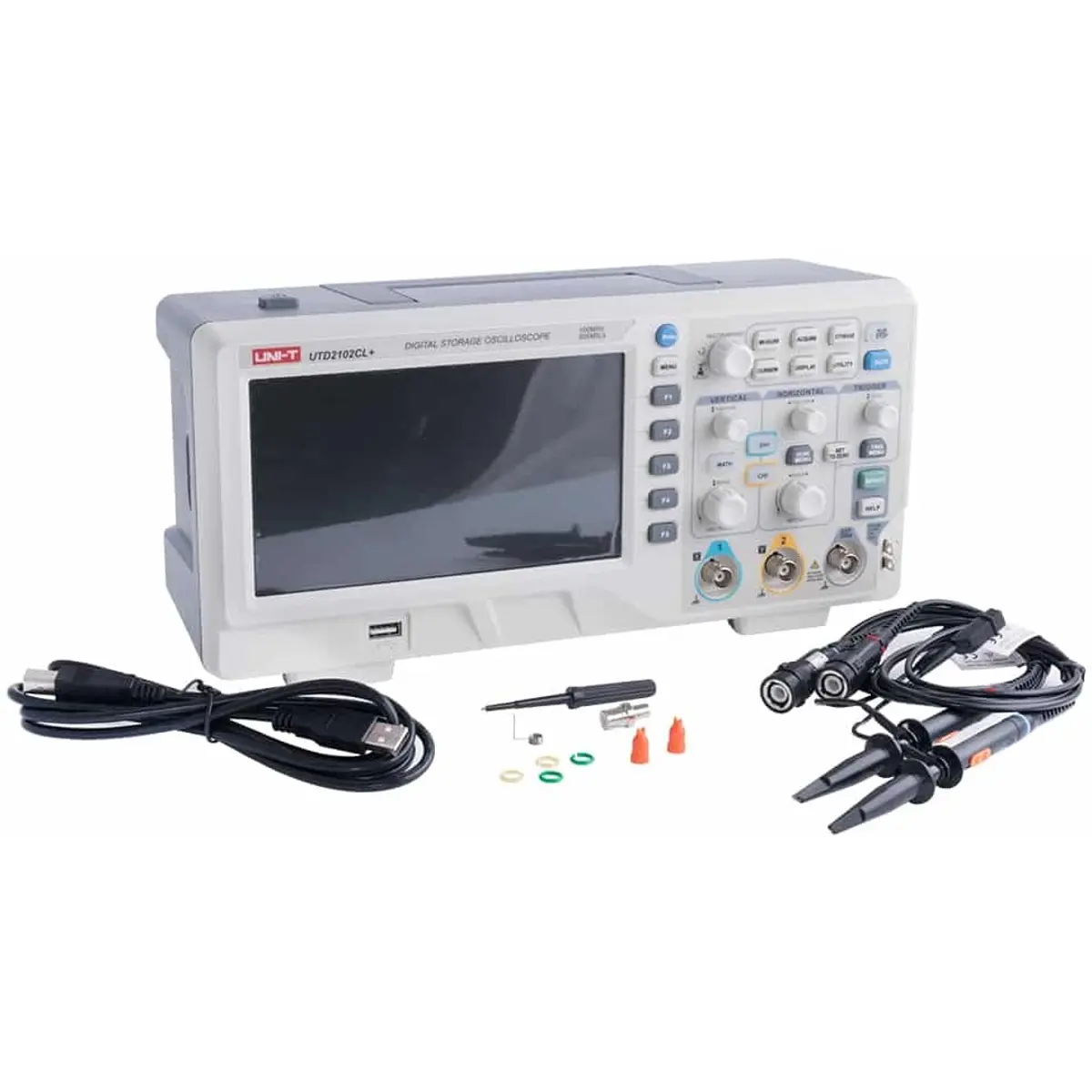 O UNI-T UTD2102CL+ é um poderoso osciloscópio de 2 canais, muito adequado para laboratórios de eletrónica e escolas, graças à sua excelente relação preço-desempenho. Com largura de banda de 100 MHz e taxa de amostragem de 500 MSa/s, o UTD2102CL+ oferece resultados de medição precisos. Além disso, a interface USB permite salvar os resultados da medição.