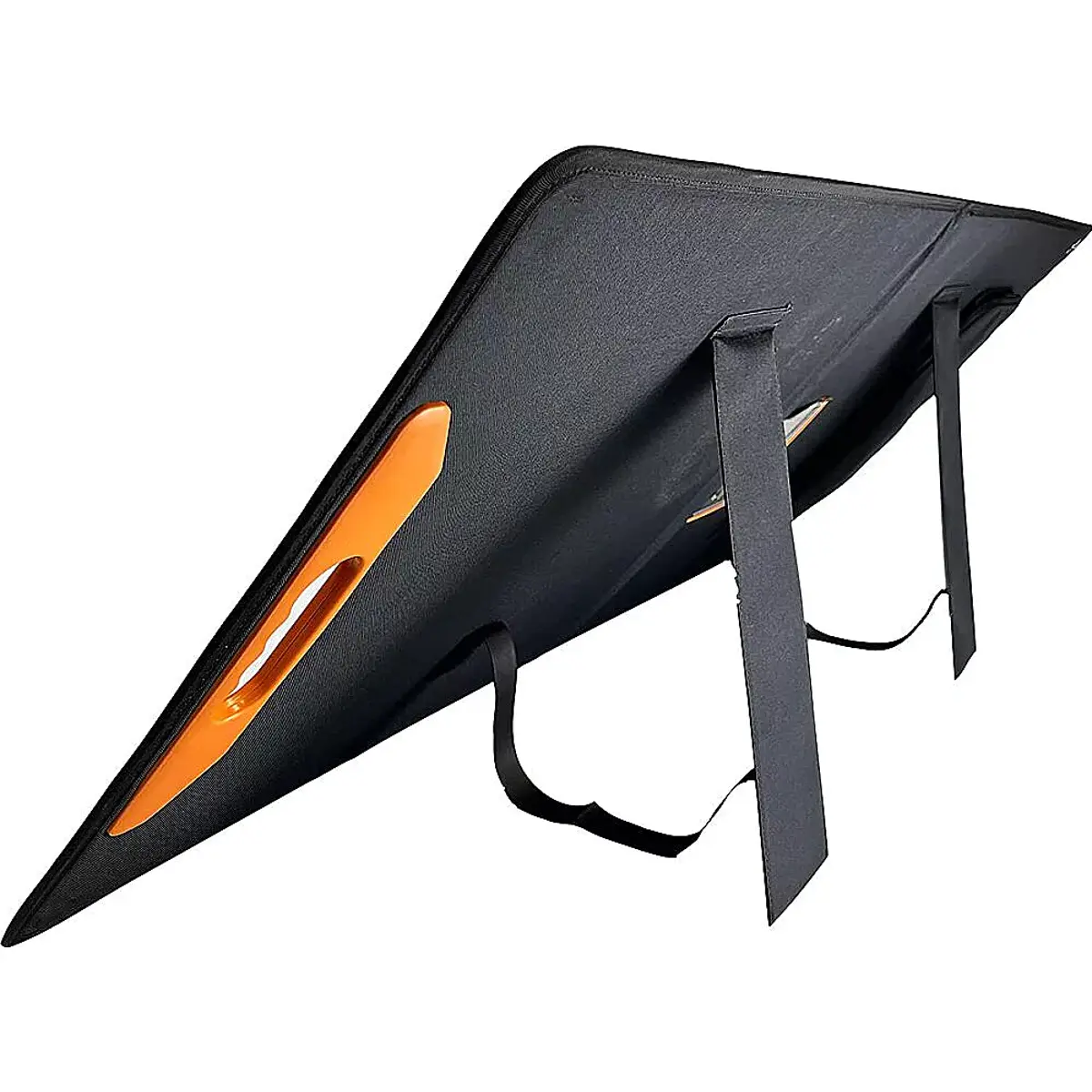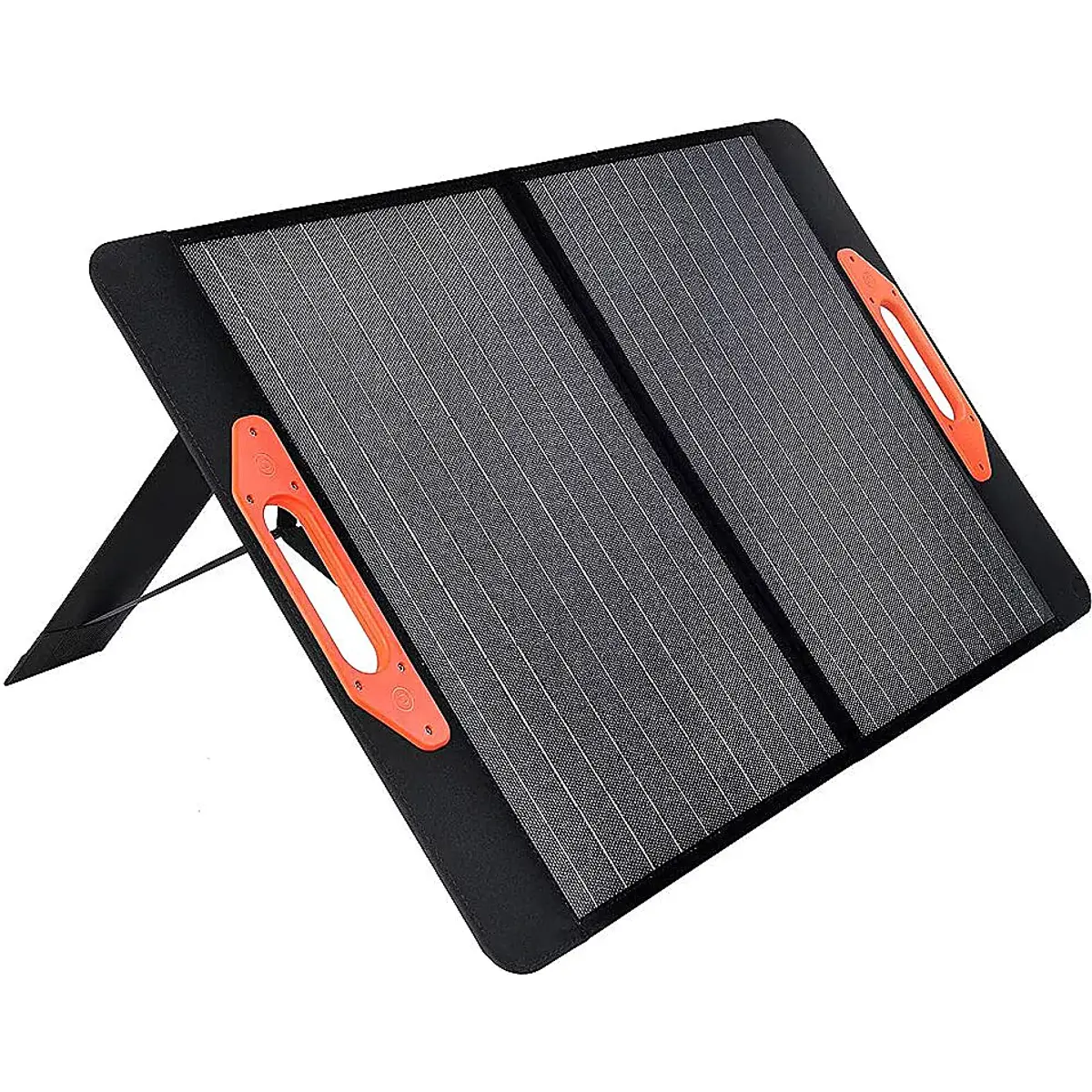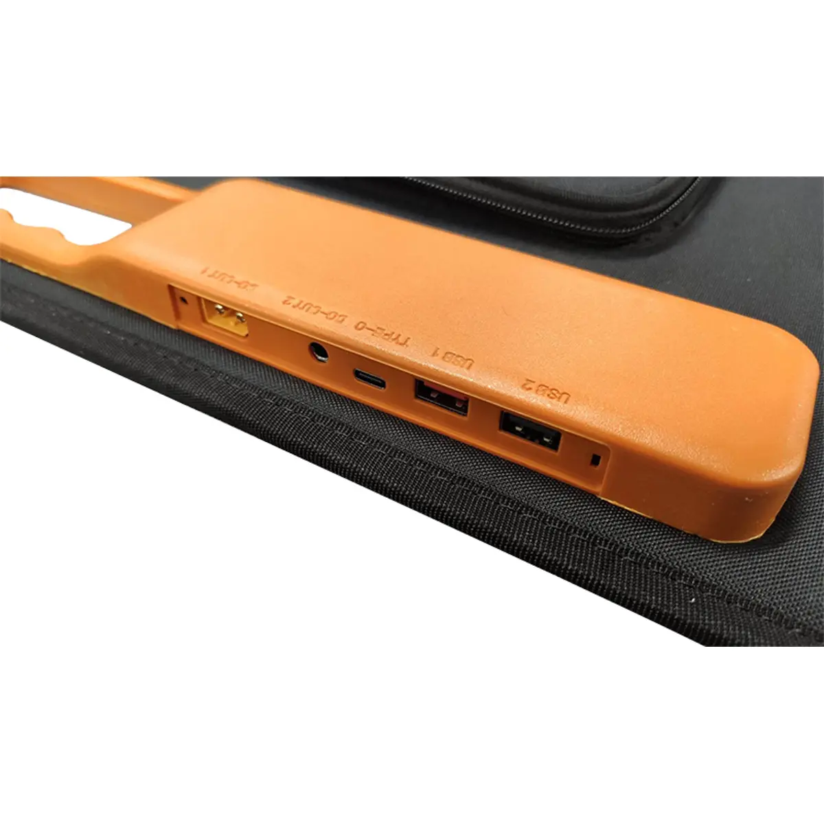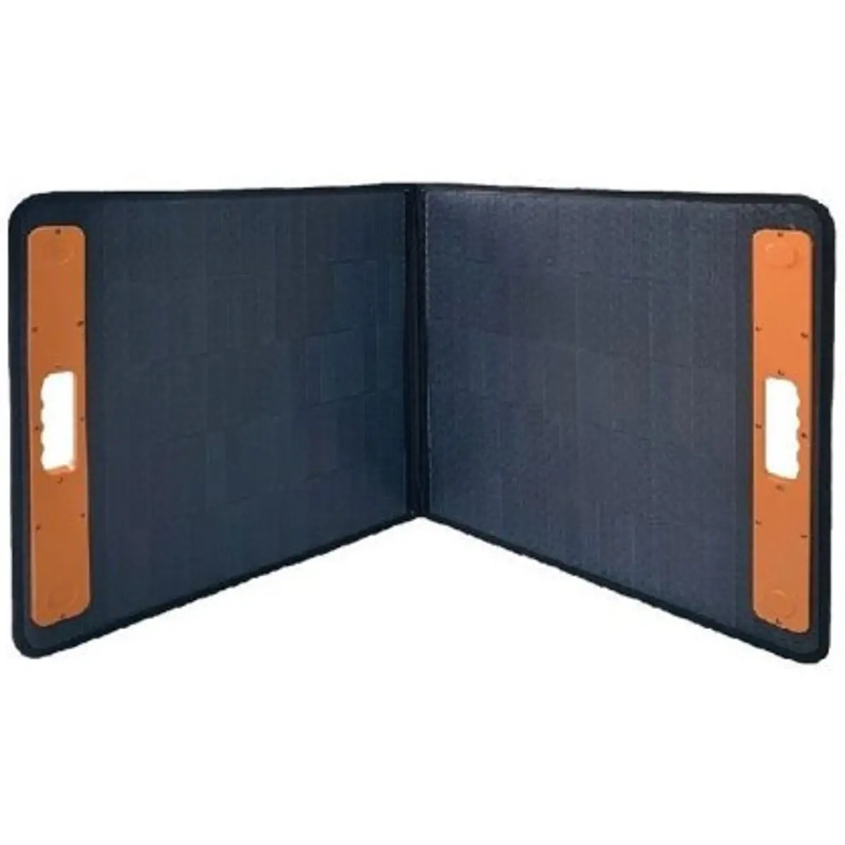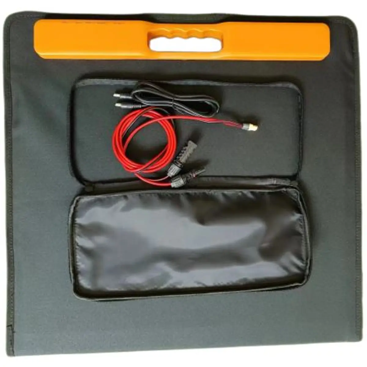 Painel fotovoltaico monocristalino de 100 W com construção em ETFE dobrável para facilitar o transporte e armazenamento. Disponibiliza portas USB-C PD, USB_A e USB-QC3.0, além de saídas DC 5,5x2,1 mm e XT60, permitindo carregar telemóveis, laptops e outros dispositivos. Ideal para atividades ao ar livre como camping e viagens, funciona entre -20°C e +65°C. Dimensões quando dobrado: 595×565×40 mm; peso de 5 kg.