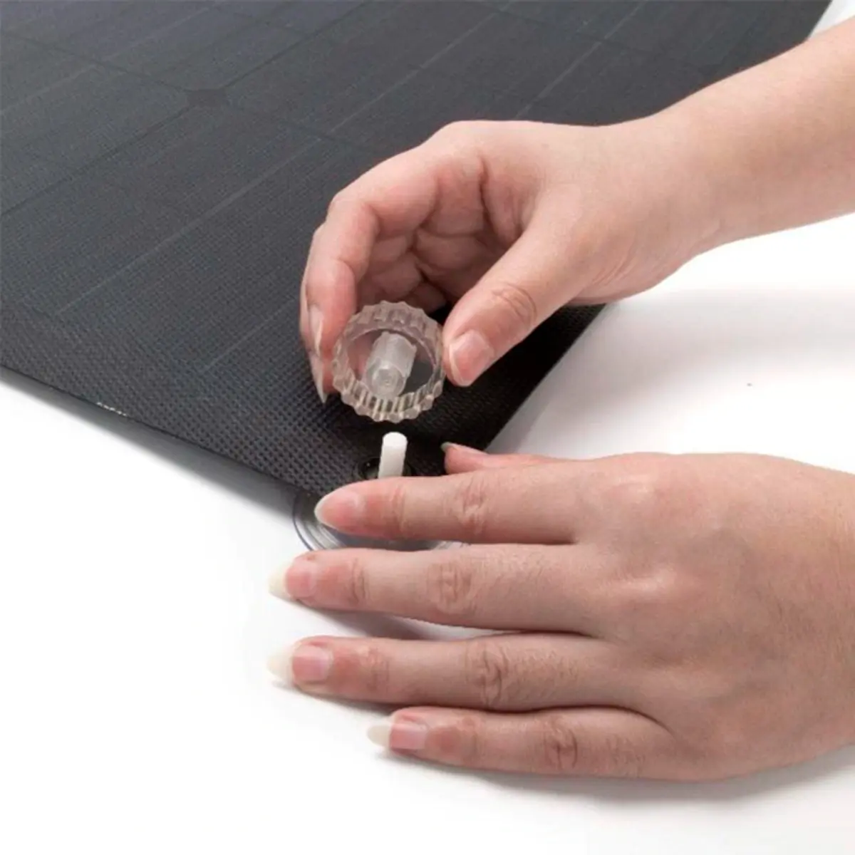 Conjunto de ventosas para fixação de painel solar desdobrável em superfícies lisas, como vidro e tejadilhos de automóveis. Proporciona montagem rápida e estável, permitindo fixar, ajustar e remover o painel com facilidade. Ideal para instalações móveis ou temporárias, sem danificar as superfícies.