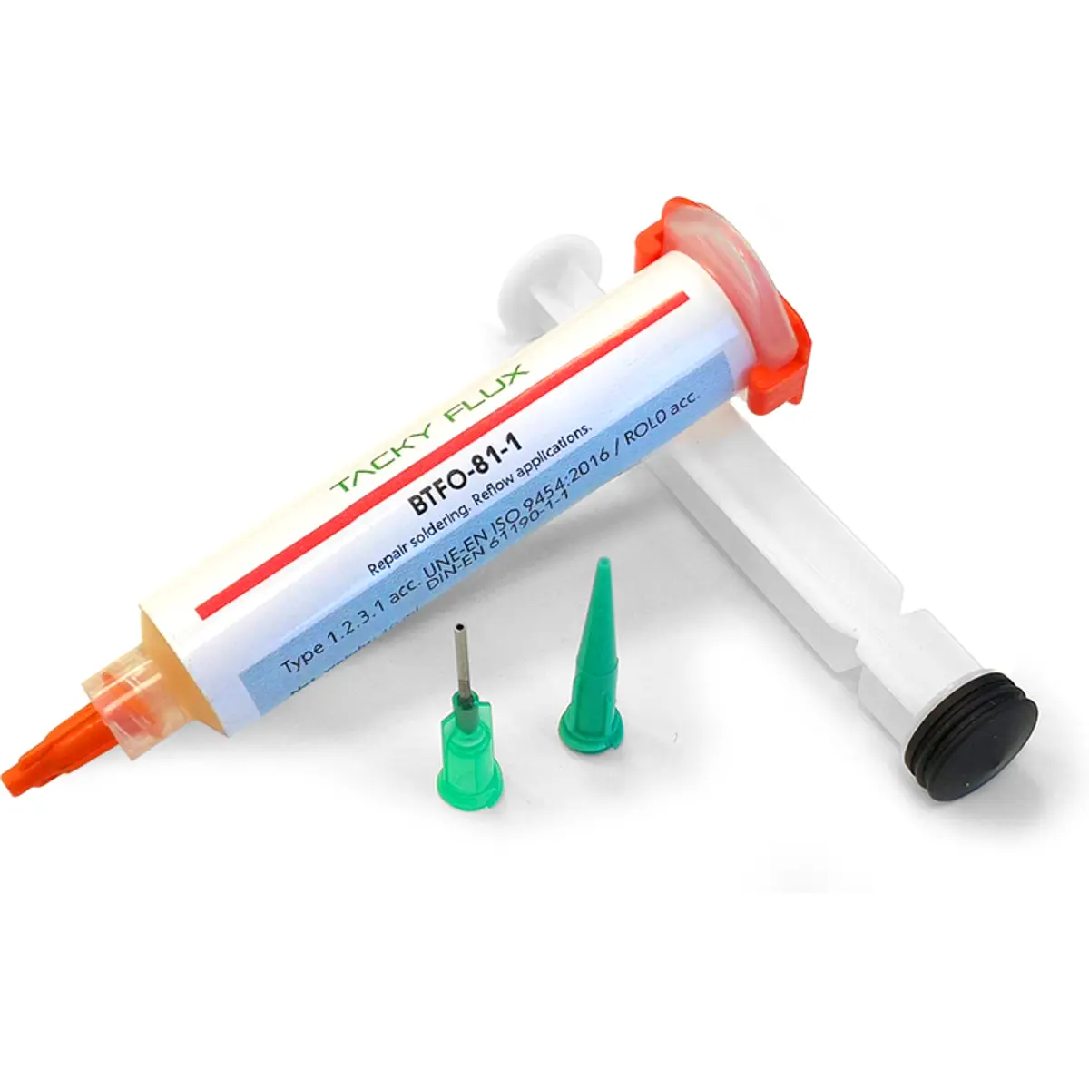 O Fluxo "gel" Tacky Flux BTFO-81-1 foi especialmente desenvolvido para soldagem de reparação, retrabalho, etc. É adequado para banho de estanho e aplicações especiais. O Tacky Flux BTFO-81-1 é caracterizado por suas propriedades aprimoradas de molhamento e espalhamento. A aplicação é feita através de uma seringa doseadora com ponta metálica, permitindo dosagem precisa e posicionamento do fluxo. O processamento do fluxo adesivo de soldagem pode ser feito com ar quente ou ferros de soldar.