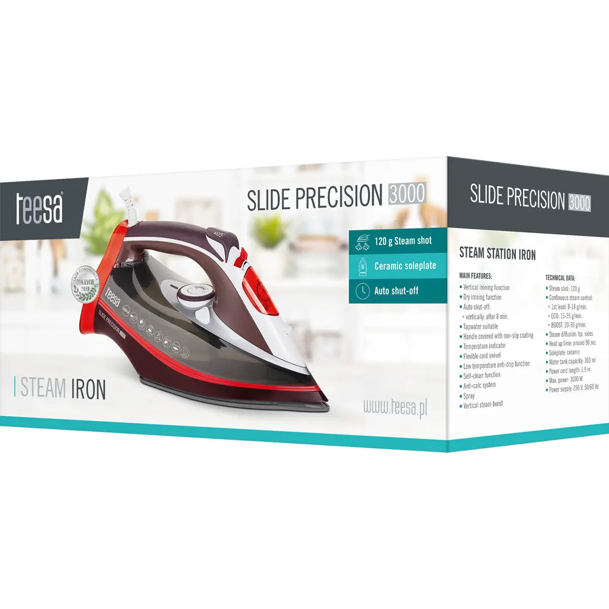 Os produtos da marca Teesa caracterizam-se pela sua atenção à segurança. Este é também o caso do ferro Slide Precision 3000, que está equipado com uma função de desligamento automático. Já não tem de se preocupar com o facto de se esquecer de desligar o ferro.