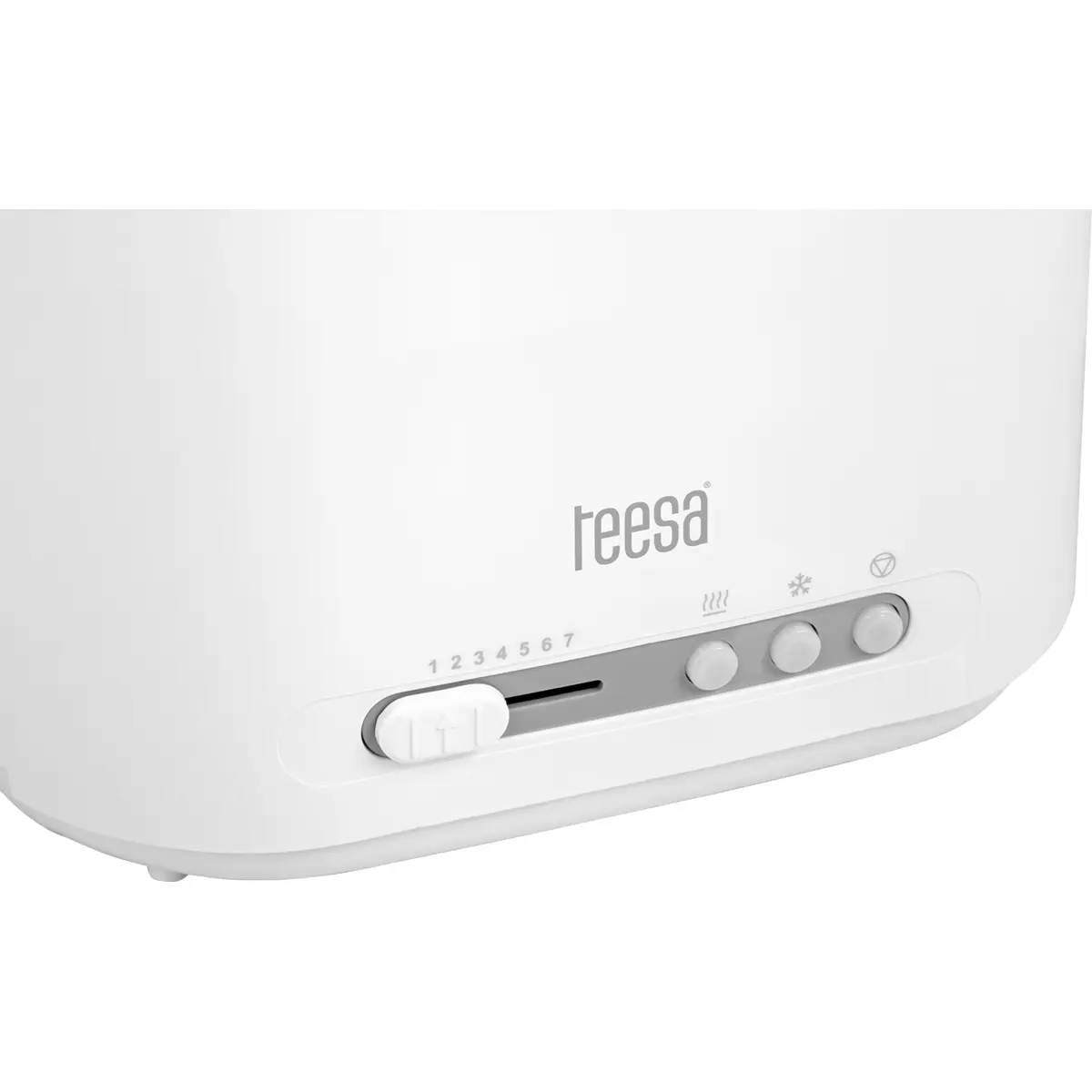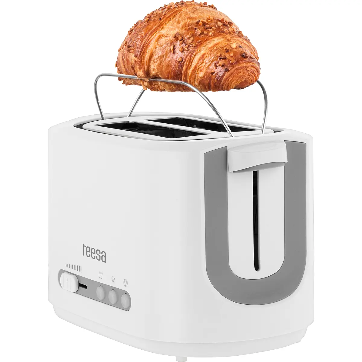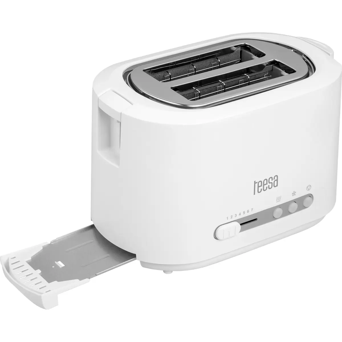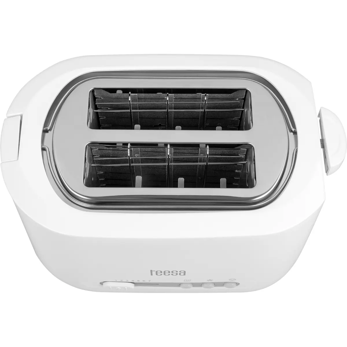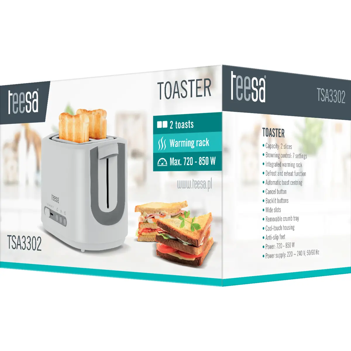 A torradeira Teesa tem um ajuste do nível de tostagem em 7 fases e um botão de paragem, o que facilita a preparação de torradas de acordo com as preferências de cada um dos membros da família. Para além disso, a função de centragem automática garante que a torrada fica sempre bem tostada. Também vai adorar as funções adicionais que permitem não só descongelar o pão, mas também aquecer as torradas. E não é tudo! Deseja uma baguete estaladiça? Pode utilizar a grelha de tostagem integrada.
