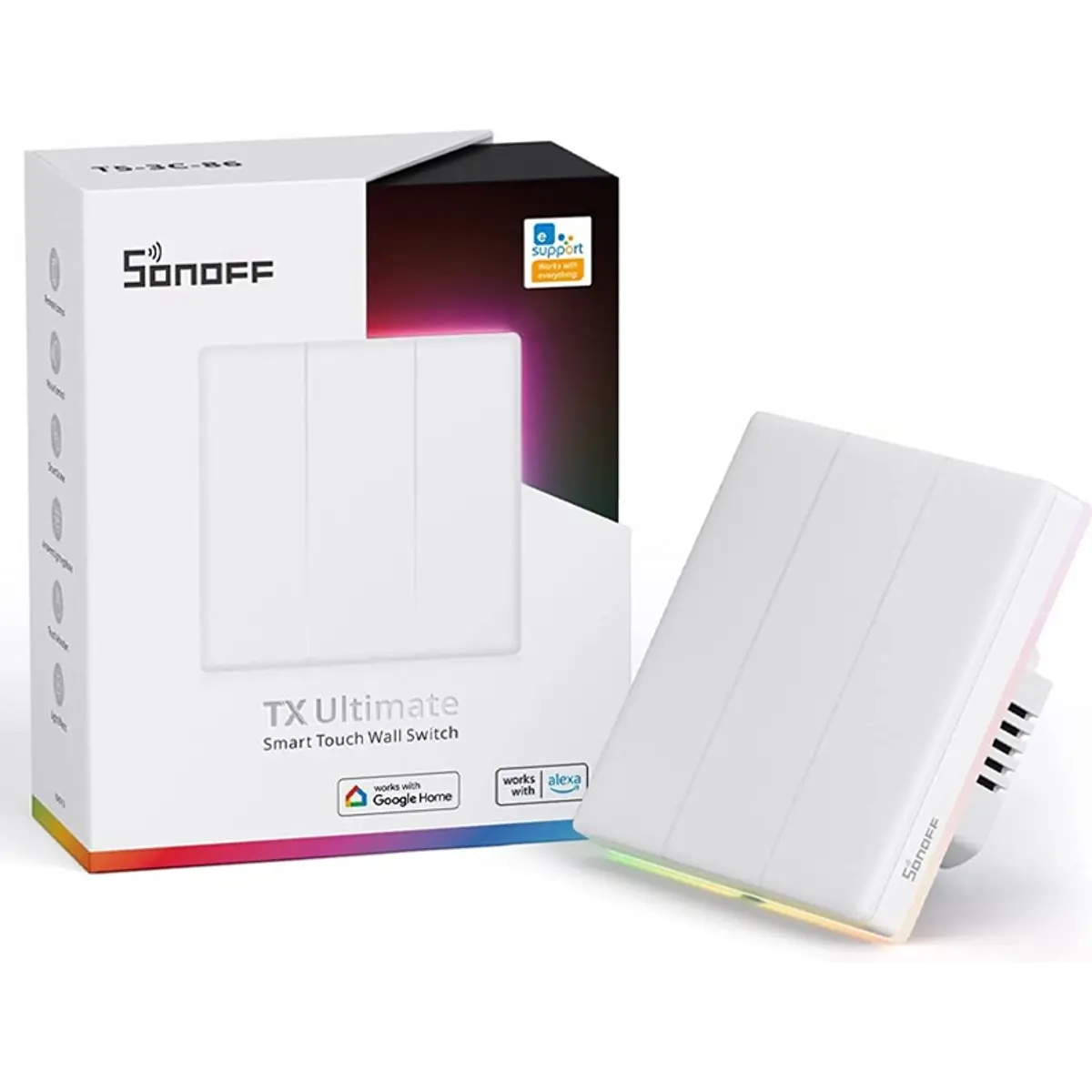 O SONOFF TX Ultimate (T5) WiFi Smart Touch Wall Switch é um interruptor de parede sensível ao toque com uma ampla área de toque e um design elegante. Com recursos como luzes LED ambientais, integração de luz, som e vibração, além da capacidade de ser usado como gateway eWeLink-Remote, o T5 oferece um controle inteligente e personalizado. Possui uma tampa substituível, que permite adaptá-lo ao estilo de decoração de qualquer ambiente, tornando-o uma opção versátil e funcional para modernizar a sua casa.