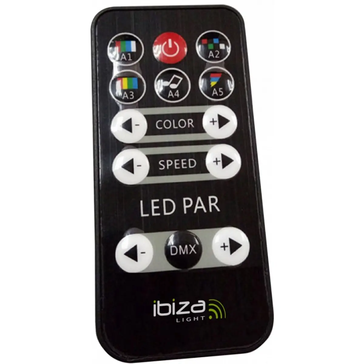 Projetor PAR compacto, equipado com 12 LEDs de 1W em configuração RGBW, que também pode funcionar sem controlador DMX, usando controlo remoto ou manualmente, usando os botões.