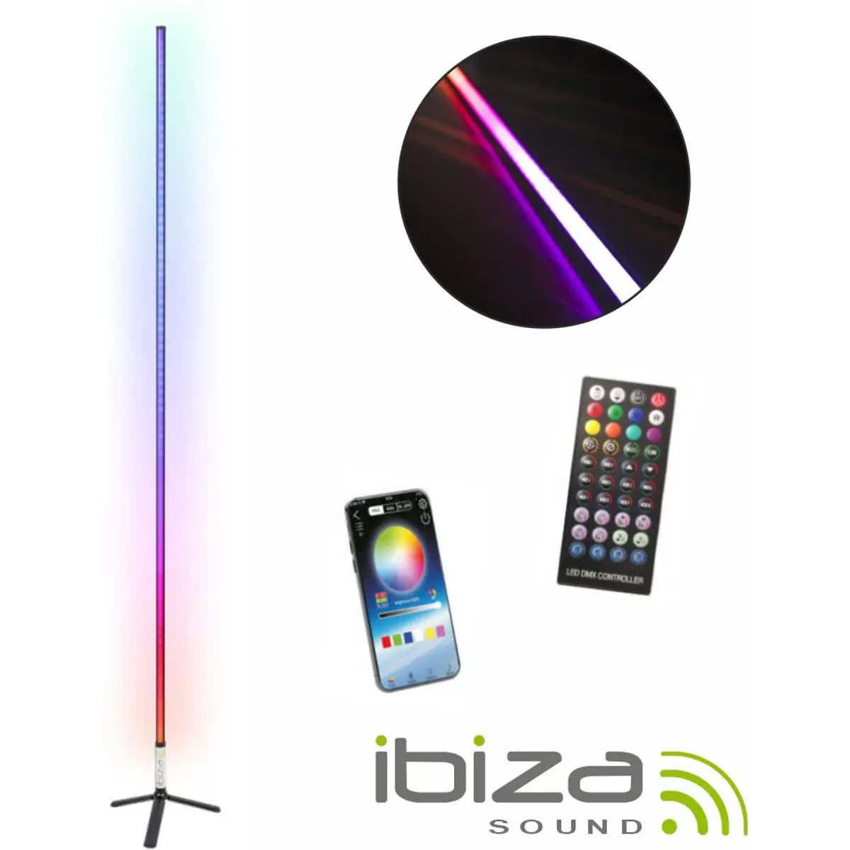 O candeeiro de chão Ibiza Magic Color Stick RGB é uma opção minimalista e funcional para criar a atmosfera perfeita em qualquer espaço, como quartos, salas de estar ou cabines de DJ. Este tubo de luz ultrafino e discreto possui 1 metro de comprimento e é capaz de emitir uma luz bonita e brilhante em 7 cores distintas, oferecendo infinitas possibilidades de combinação RGB.