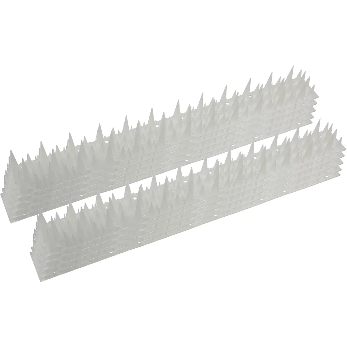Conjunto de espigões repelentes com três filas, desenhados para evitar o pouso de pombos, gaivotas e outras aves em telhados, beirais e estruturas adjacentes. Fabricados em plástico PP de alta qualidade e totalmente resistentes às intempéries, oferecem proteção duradoura. Inclui 10 peças com dimensões de 40x4,2x3,6 cm e um design com comprimentos variados para melhorar o efeito dissuasor. Pode ser montado com pregos/parafusos, abraçadeiras ou fita adesiva de dupla face (opcional — não incluída).