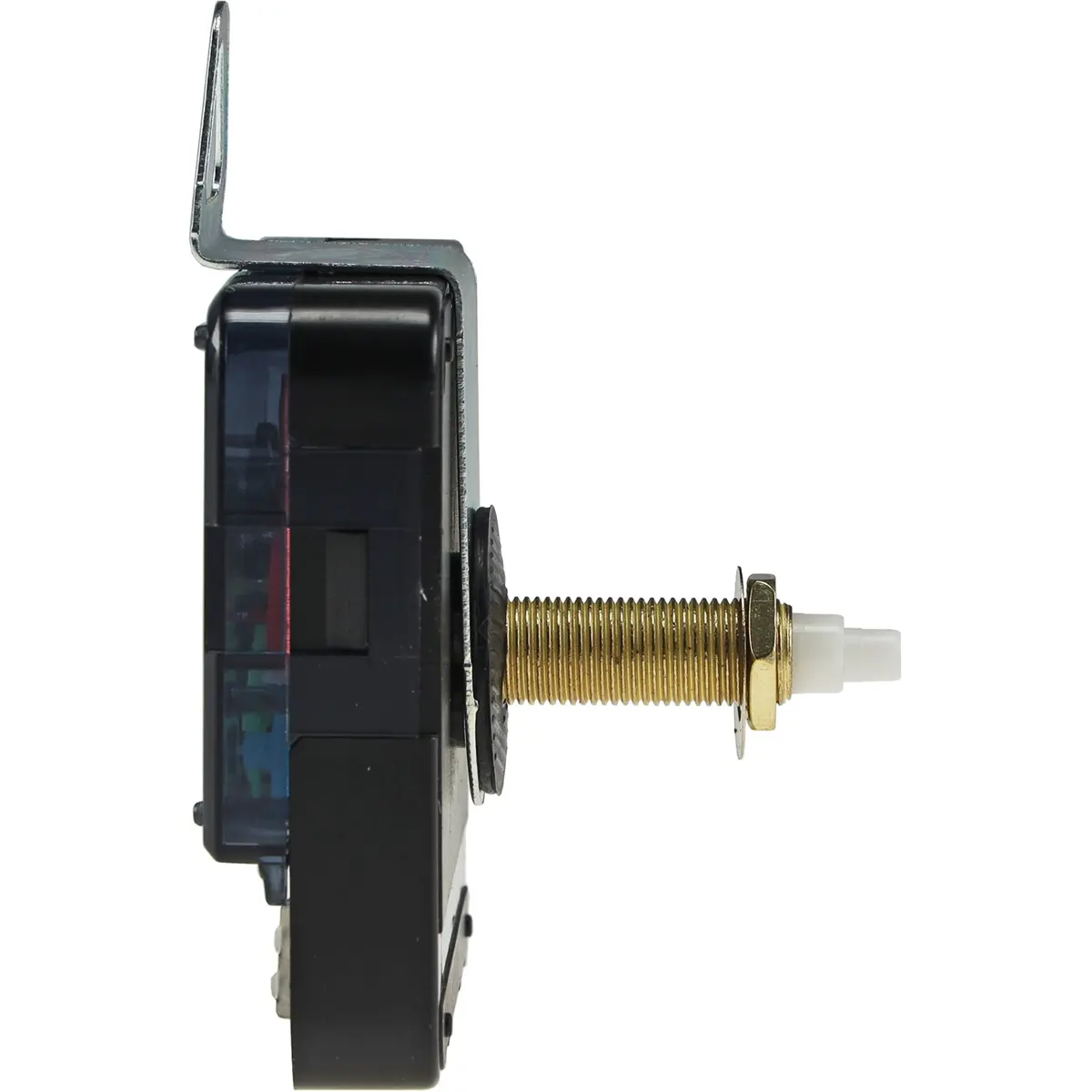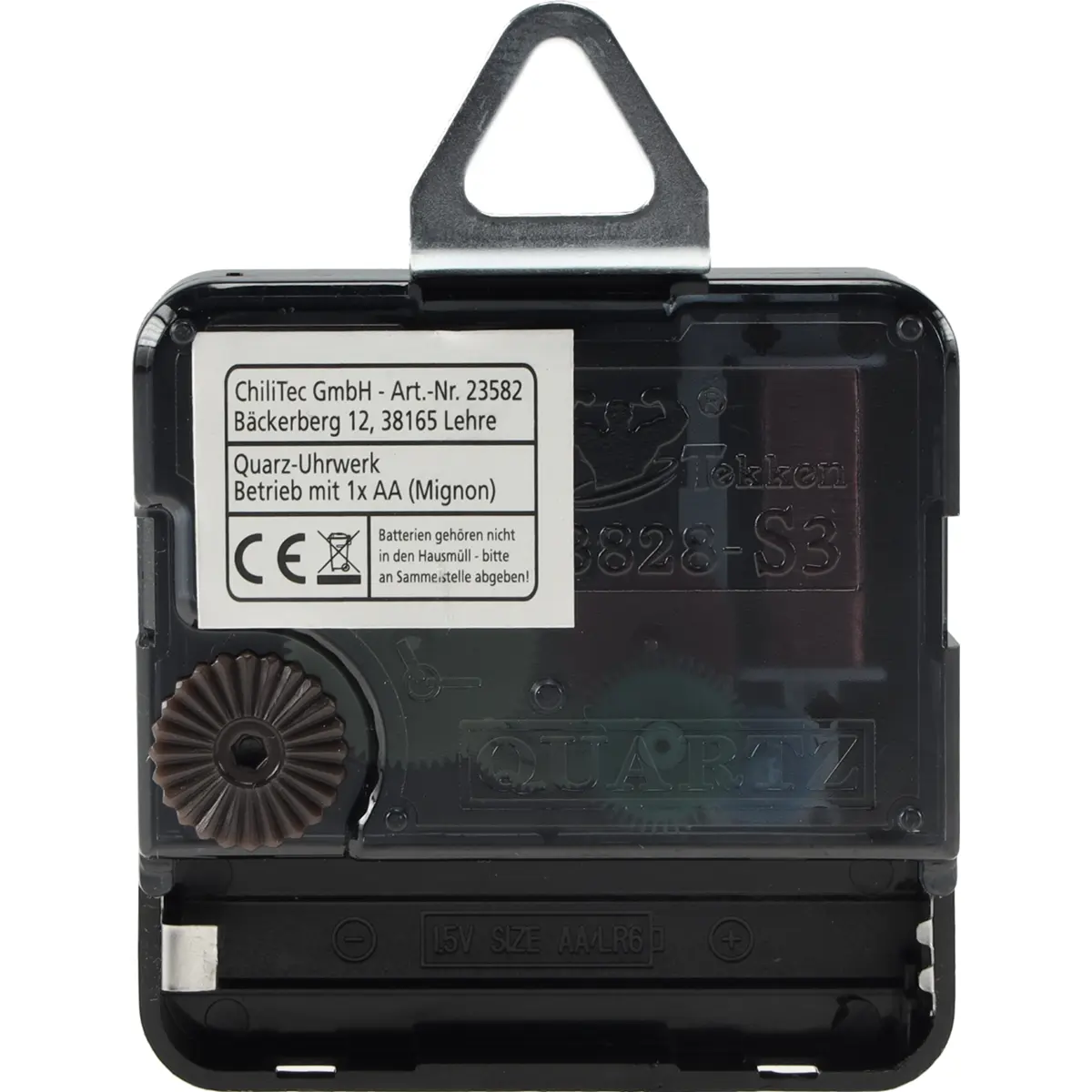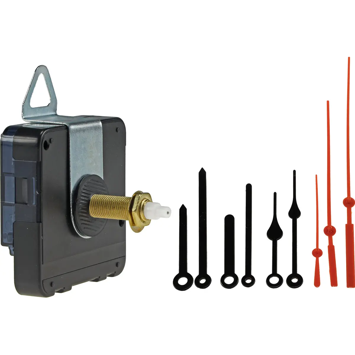 Este mecanismo de relógio utiliza um movimento de quartzo com três conjuntos de ponteiros para horas, minutos e segundos. Os ponteiros das horas e minutos são pretos, enquanto o ponteiro dos segundos é vermelho. Alimenta-se com uma pilha AA (não incluída) e tem uma rosca de 25 mm, com comprimento total de 32 mm menos porca e gancho de parede. As dimensões do movimento são aproximadamente 55 x 55 x 15 mm, compatível com montagem em parede ou superfície e com variações de comprimento entre os conjuntos para ajustar o estilo do relógio.