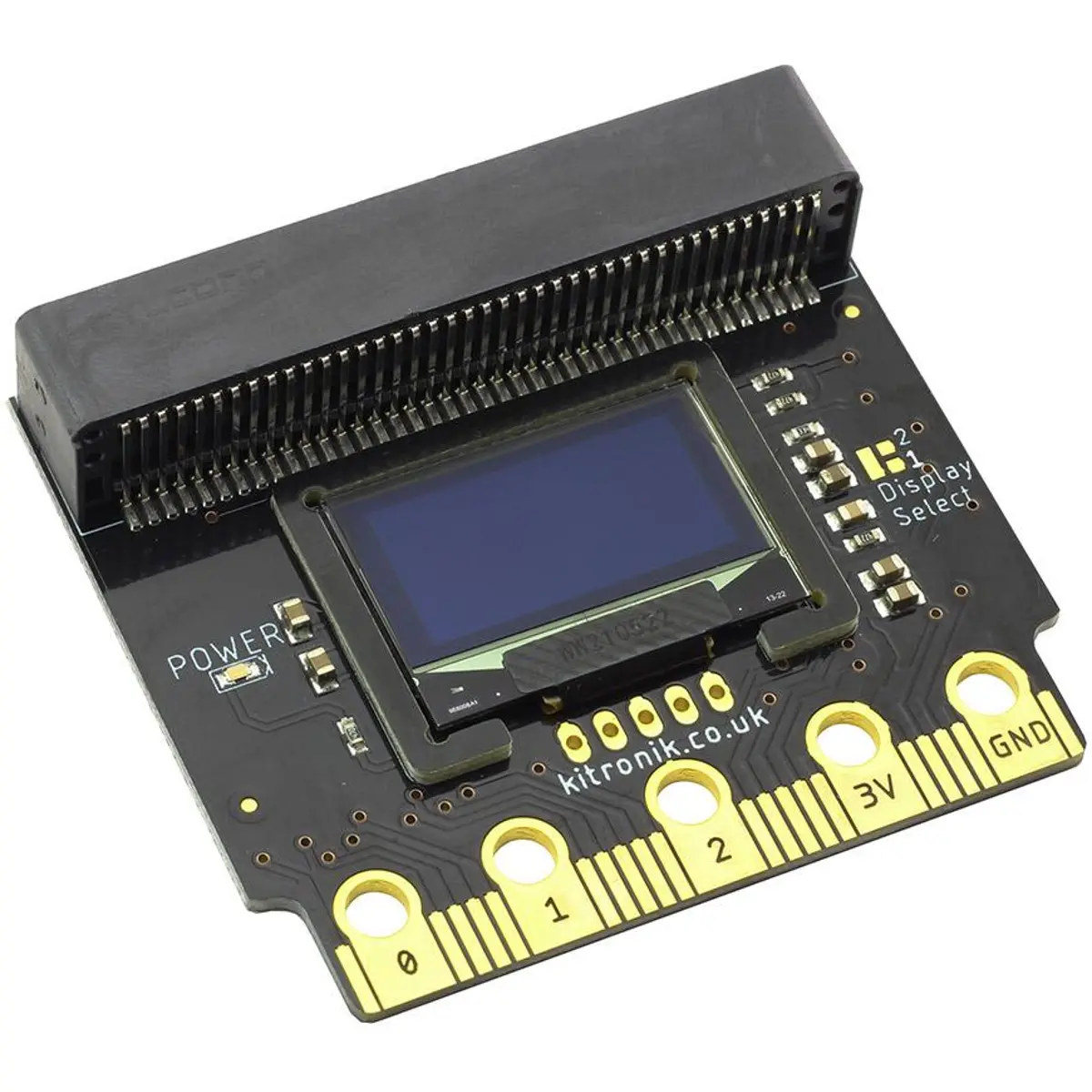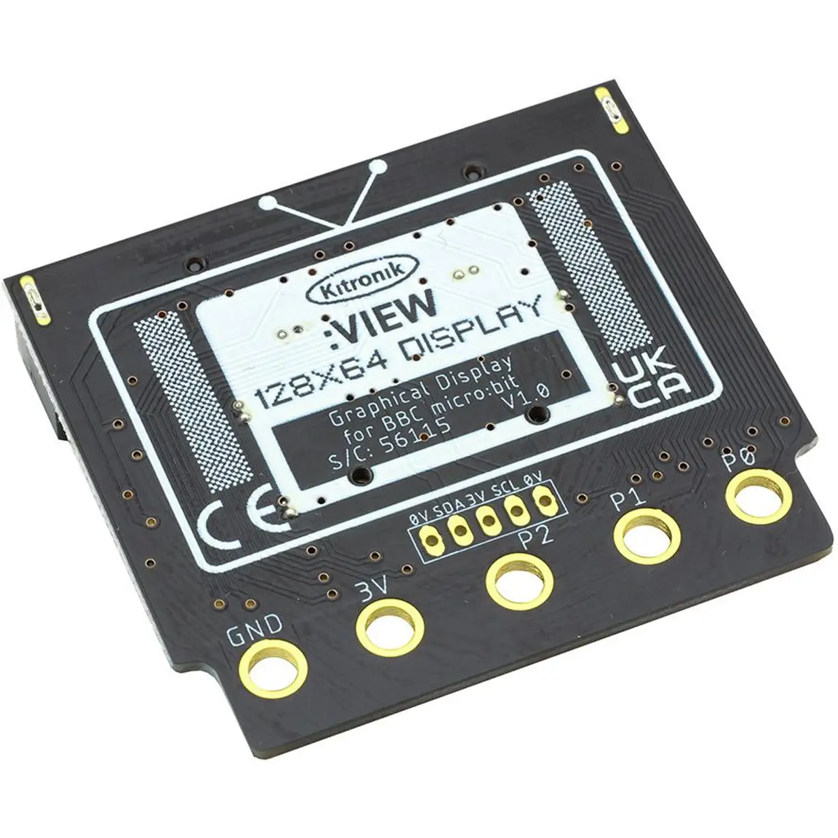 O display OLED Kitronik :VIEW Graphics128 oferece ao utilizador a capacidade de adicionar um display monocromático 128x64 ao BBC micro:bit. O conector de borda embutido permite que o micro:bit seja encaixado na placa sem a necessidade de fixações adicionais. A placa também possui um conector de E/S no estilo micro:bit, o que significa que pode ser encaixada em qualquer outro acessório micro:bit que possua um slot para inserir um micro:bit. Todos os pinos do BBC micro:bit são rastreados para fornecer aos pads de borda o uso completo do BBC micro:bit, com a adição de um display. Como o micro:bit se encaixa diretamente na placa, não são necessárias ferramentas, fixações ou soldagem.