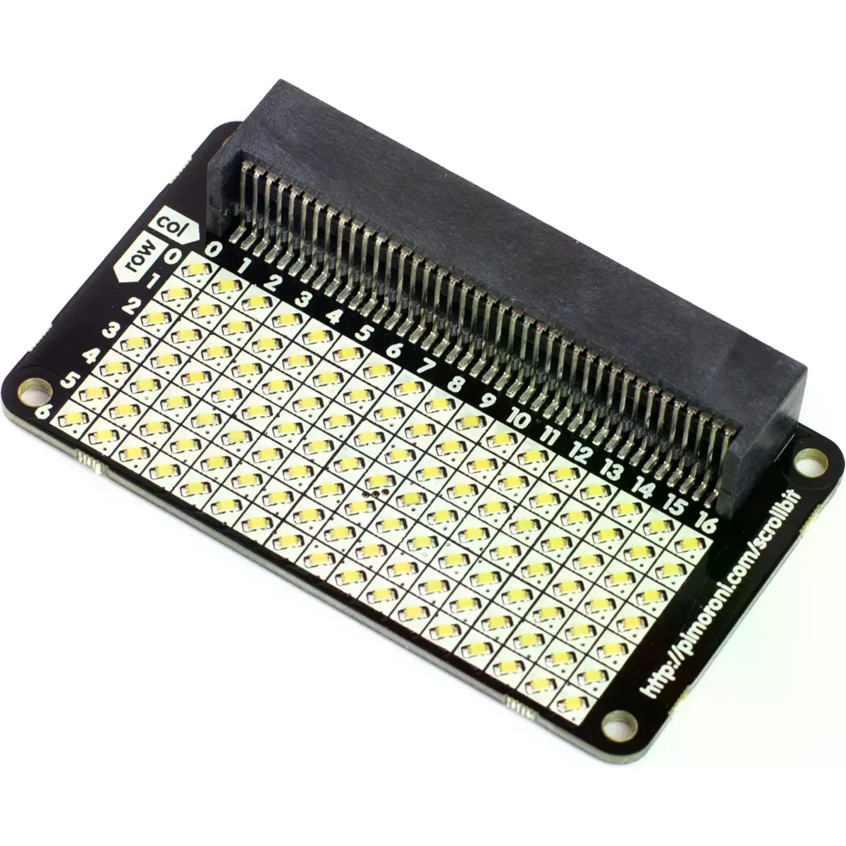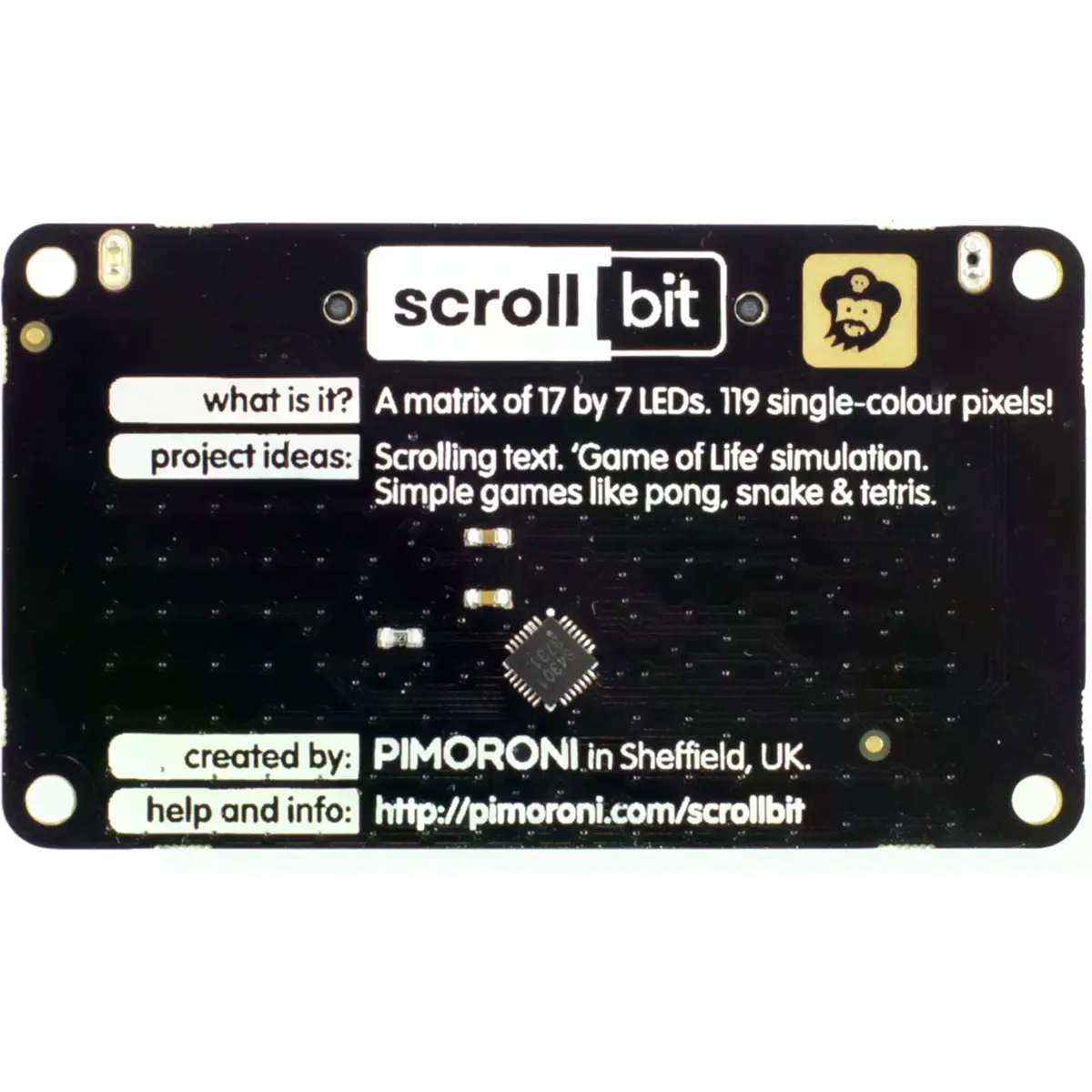 O scroll:bit é um pequeno display com muitos pixels! Seus 119 LEDs brancos brilhantes são perfeitos para rodar mensagens com o micro:bit, ou para animações, gráficos e muito mais.