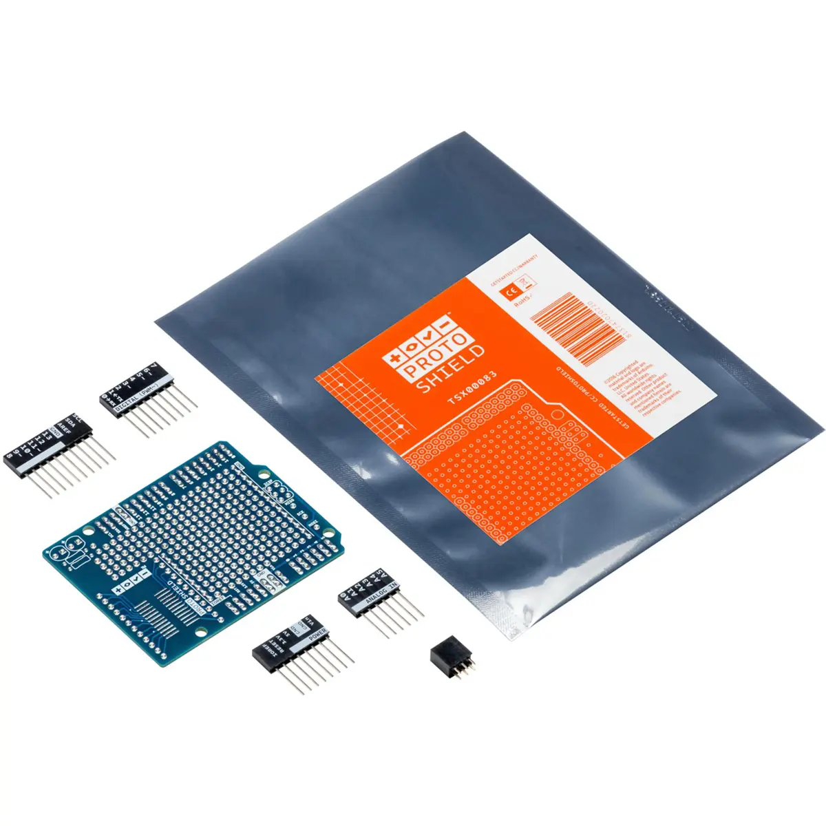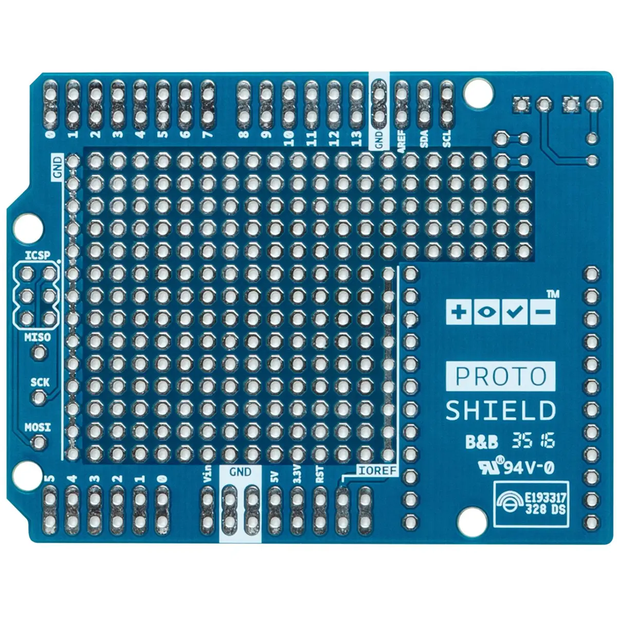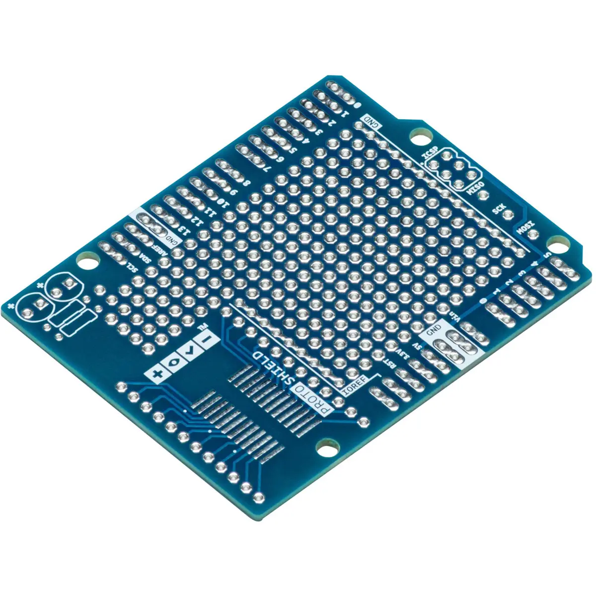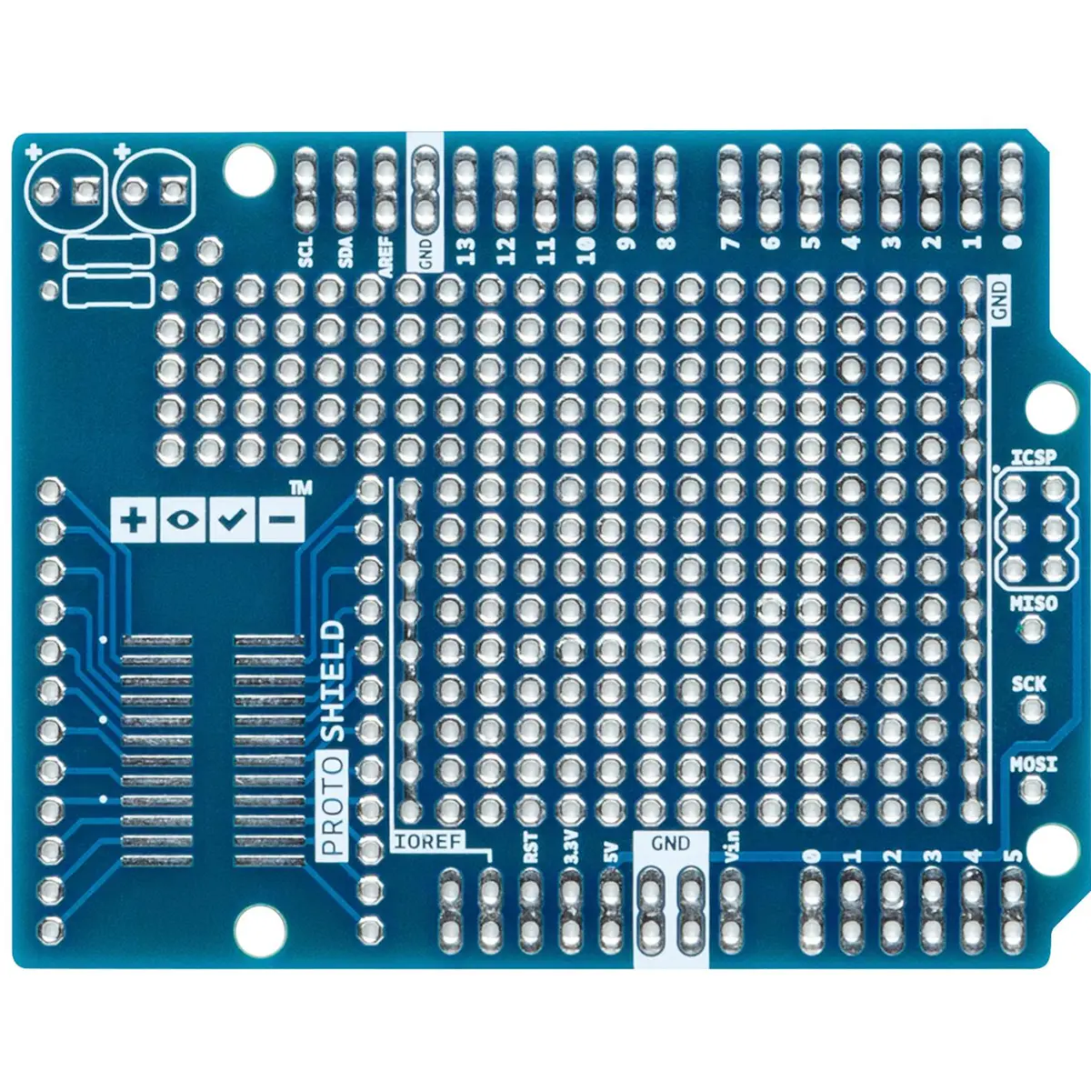 O ProtoShield facilita a criação de circuitos personalizados. Pode soldar facilmente ICs TH (Through-Hole) ou SMD (Surface Mount Device) na área de prototipagem para testá-los com a sua placa Arduino. A área SMD é projetada para um máximo de 24 pinos de circuito integrado SOIC (Small Outline Integrated Circuit), e a área TH contém muito espaço para os componentes necessários ao redor do seu projeto. Até pode fixar uma mini placa de ensaio (não incluída) na área de prototipagem para uma operação sem soldadura. A área de prototipagem inclui também duas linhas de alimentação (IOREF e GND), duas áreas para LEDs e pads para os sinais SPI para placas que possuem SPI apenas no cabeçalho ICSP, como a placa Zero.