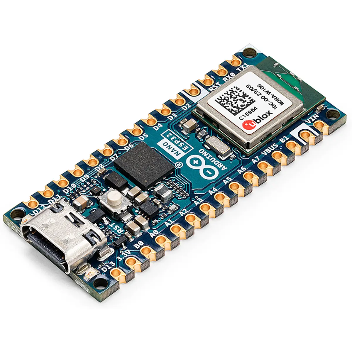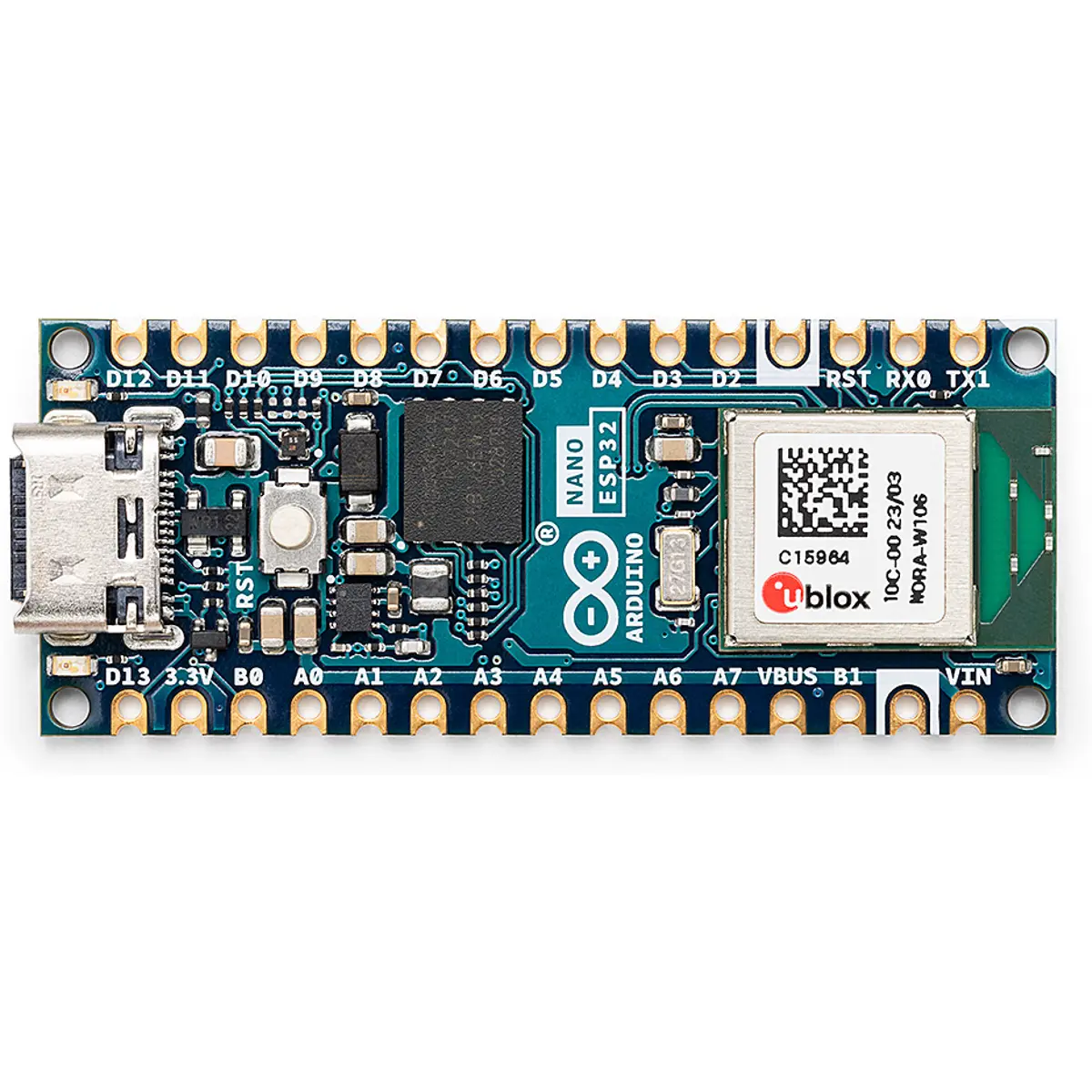 ◾ Microcontrolador Arduino Nano ESP32 com pinos soldados: ABX00083