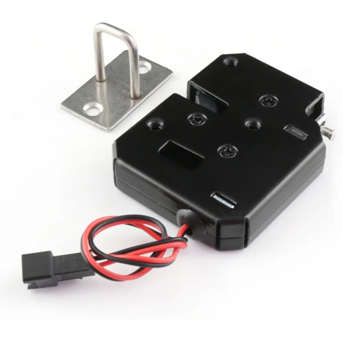 Fechadura eletromagnética que funciona com DC12V. Uma vez energizada, esta destranca o trinco e empurra a porta com peso de 0,5 a 4 kg facilmente. A fechadura só precisa de energia quando for abrir a porta, o que significa que esta possui um consumo muito baixo. Pode ser usada em caixas de correio, máquinas de venda, armários, e também possui uma chave de emergência.