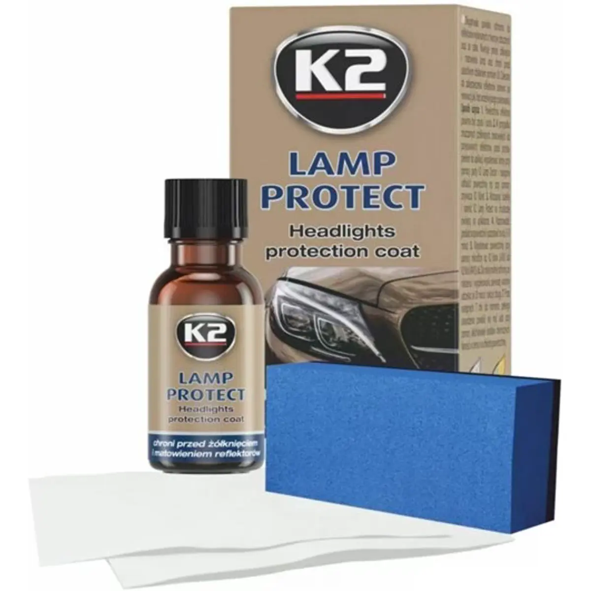 K2 LAMP PROTECT é uma solução de proteção de longa duração, destinada a faróis de plástico e vidro. Evita o amarelamento e o opacidade das lâmpadas, protege contra os danos causados pelos raios UV e mantém a superfície do farol limpa, repelindo água e facilitando a remoção da sujidade. Além disso, protege os faróis contra riscos leves.