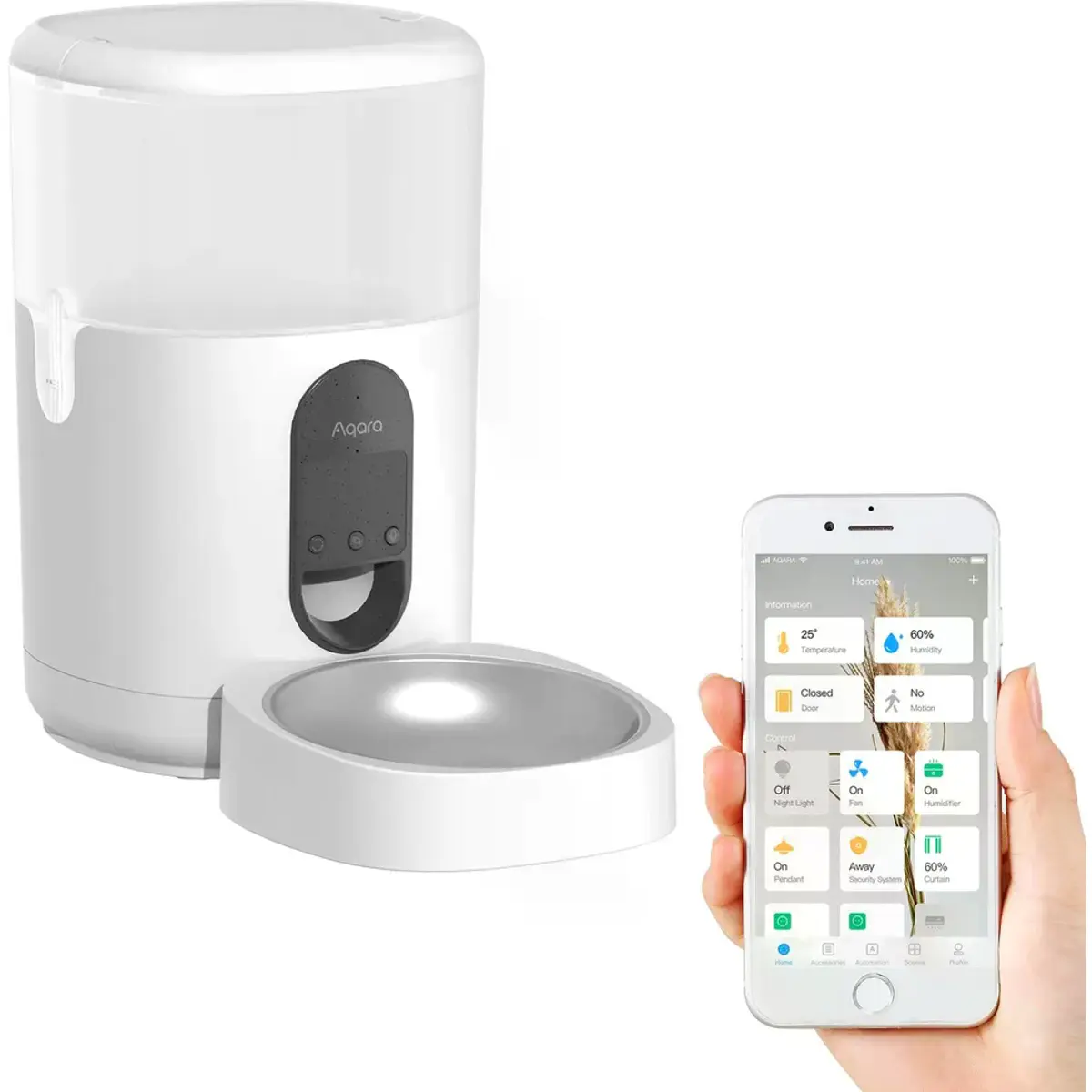 Alimentador inteligente para cães e gatos com conectividade Zigbee 3.0 que facilita a administração da alimentação. Permite programação de horários e quantidades, controlo remoto via rede doméstica e automações locais através do Aqara Home. Oferece monitorização da ração em gramas para assegurar uma alimentação adequada, com backup de bateria opcional para continuar a operar na ausência de energia. Atua ainda como repetidor Zigbee para melhorar a cobertura da rede, proporcionando conveniência, precisão e gestão remota do pet.