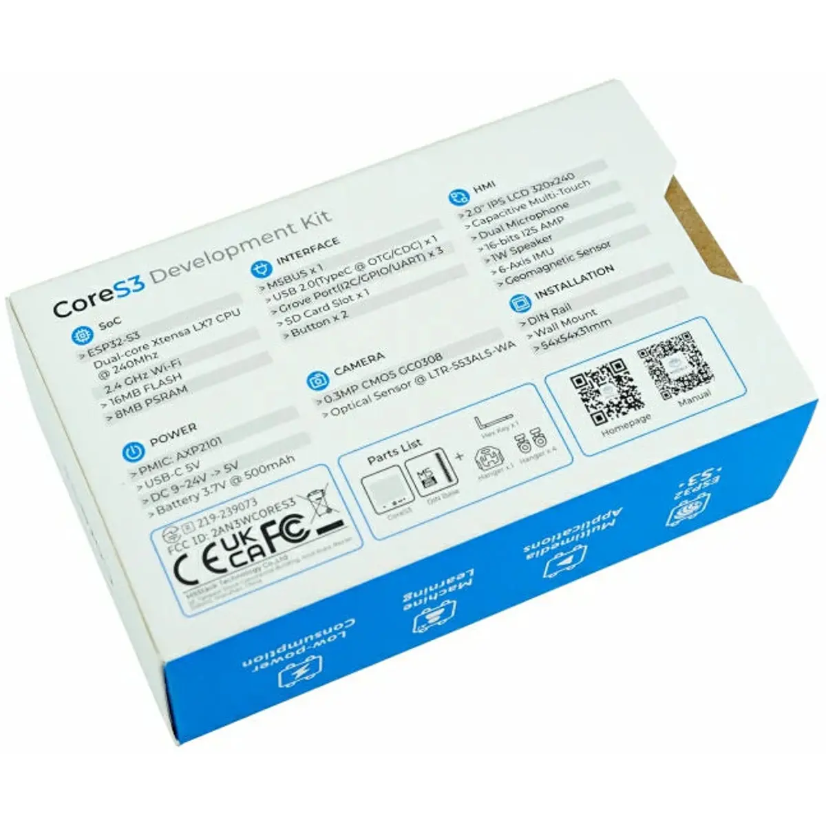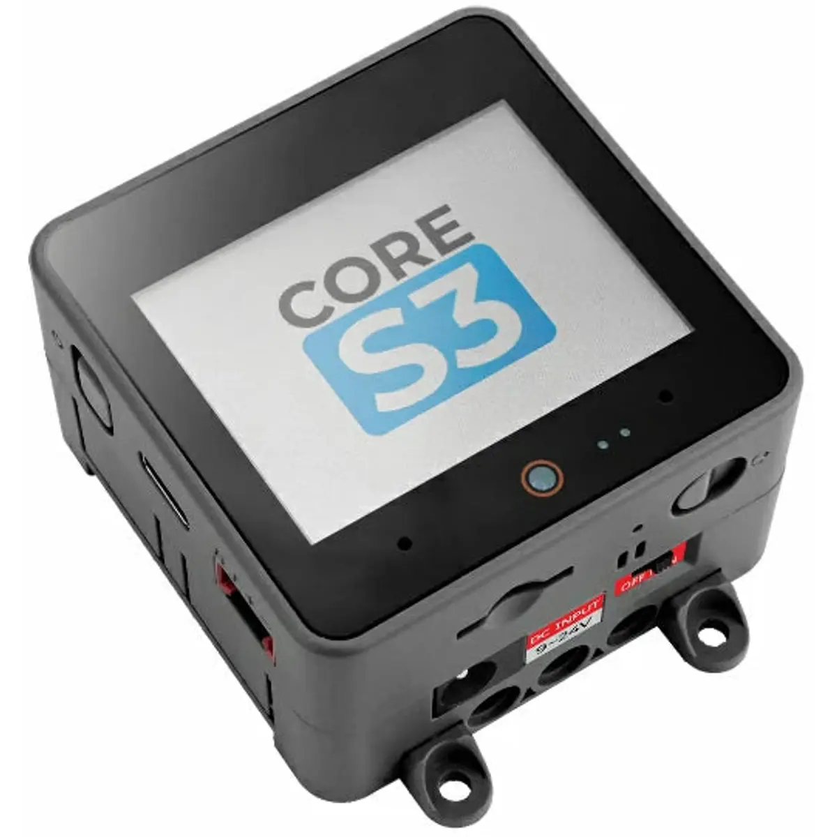 A saída de som no CoreS3 é optimizada com o chip amplificador de potência I2S de 16 bits de alta fidelidade AW88298, acompanhado por um altifalante de 1W incorporado para uma reprodução de áudio nítida. Para a entrada de som, o kit incorpora o chip de descodificação de áudio ES7210 e a entrada de microfone duplo. A parte lateral do dispositivo inclui um botão de alimentação independente e um botão de reinício (RST), complementados por um circuito de atraso auto-construído. Ao premir longamente o botão de reinício, os utilizadores podem facilmente entrar no modo de transferência de programas. O kit CoreS3 é fornecido com a base DinBase, que oferece opções práticas para fixação em calha Din, na parede e com parafusos. Pode ser alimentada por uma corrente externa de 12V DC (suporta 9~24V) ou por uma bateria interna de lítio de 500mAh.