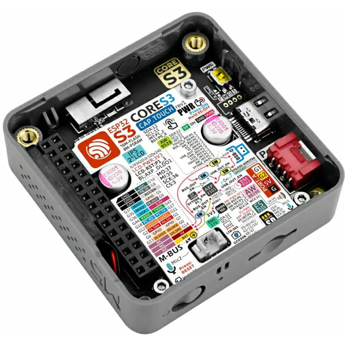 O CoreS3 oferece opções de programação cómodas através da sua interface USB-C, suportando as funções OTG e CDC. Isto permite uma ligação fácil a dispositivos USB externos e uma atualização de firmware sem complicações. O CoreS3 possui um ecrã IPS tátil capacitivo de 2.0 polegadas, protegido por um material de vidro de alta resistência. Além disso, uma câmara GC0308 de 30 W pixel está integrada na parte inferior do ecrã, acompanhada por um sensor de proximidade LTR-553ALS-WA para uma funcionalidade melhorada. A gestão de energia é assegurada pelo chip central de gestão de energia AXP2101, que utiliza um circuito de controlo do fluxo de energia de 4 vias para uma distribuição de energia eficiente. O design geral enfatiza o baixo consumo de energia. O CoreS3 inclui também um sensor de atitude de 6 eixos BMI270 e um magnetómetro BMM150 para uma deteção precisa do movimento. Com a ranhura para cartão TF (microSD) integrada e o chip RTC BM8563, estão prontamente disponíveis funções precisas de temporização e de despertar com temporizador.