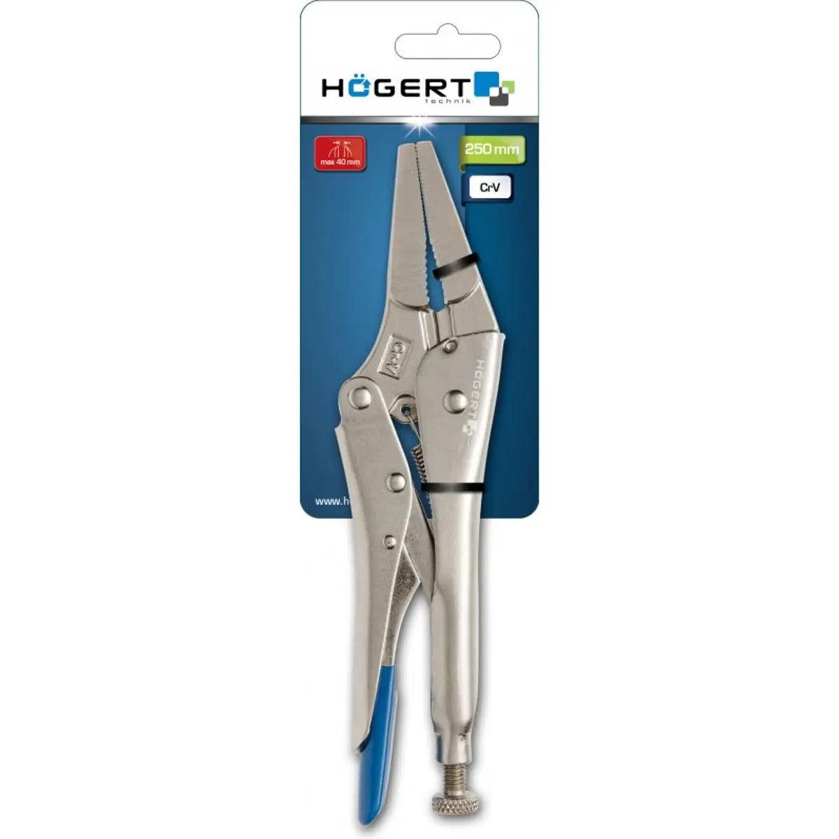Alicate de travamento alongado com mandíbulas retas para trabalhar com produtos de formato plano em qualquer ângulo. Ideal para trabalhos de soldagem.